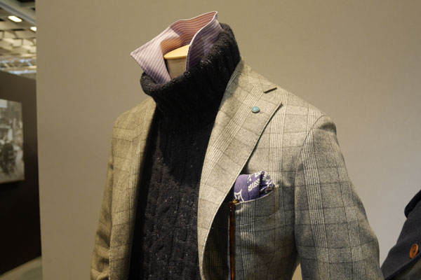 カラフルな色目や柄物が減ってきて、引き続き英国調の流れをついで、ツイードやネップ調の生地、色も赤ではなくボルドー、グリーンも少しくすんだグリーン、など落ち着いた雰囲気になってきている、と総論されている今回のPITTI UOMO。
