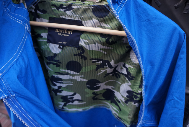 このタイプライターステッチプルブレーカーは軽やかな素材感が一番重要なだけに、裏地は背中の上部のみにnarifuriオリジナルのカモメッシュを施しています。見えないところにも気を使っていると、細かいところにもこだわっているんだなって実感したり。