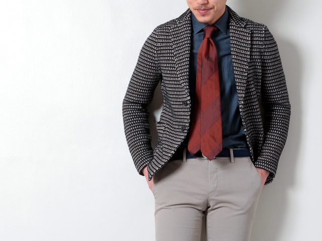 まずはジャガード織りの美しいコチラのT-JACKETから。ファッションコンシャスなコスプレ的なやつよりは、コンサバを地でいきたいワタクシ達ですが、地味なのとコンサバは違います。