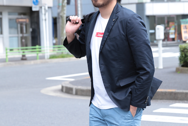 ジャケットも、シングル2Bでビジネスにもしっかり対応できるようにしながらも、ラペルを細く。別々でも使いやすいよう考えています。