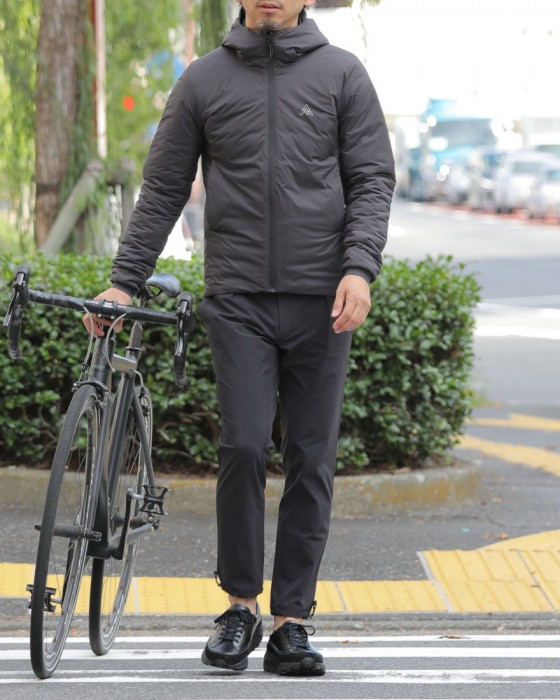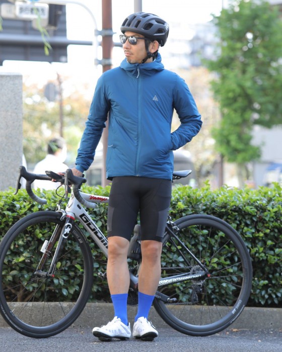 トレイルライドも想定したアイテムなだけにストイック過ぎないシルエット。肩まわりも立体的になっていることでライド中の動きが制限されにくく、ダウンよりも厚みがない分着膨れも気にならない。