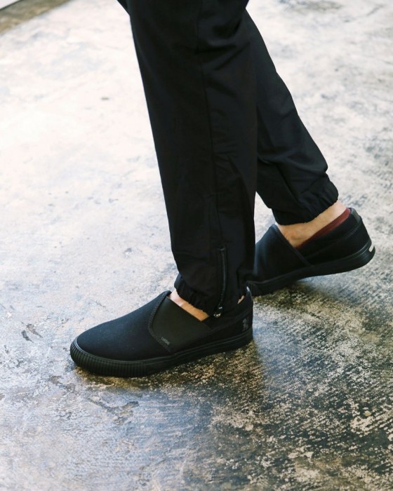 通常のスリッポンとは少しアシンメトリーなデザインがシンプルながらも新鮮味を感じさせる。急いでいる朝でもすぐに履けてフィット感も高いんですよ。