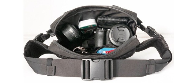 ボディバッグとして展開してますが、斜め掛けだけでなく腰につけることも可能。太いベルトが、腰にも安定して固定されます。