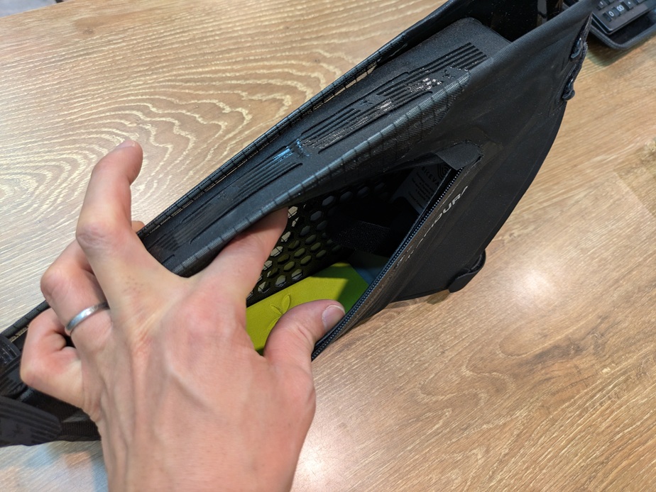 そして気になるトップチューブバッグのクロージャ―はマグネット式で、容量はエナジージェルや補給食、小型のバッテリーなどが入るくらいコンパクトな設計です。潔い!