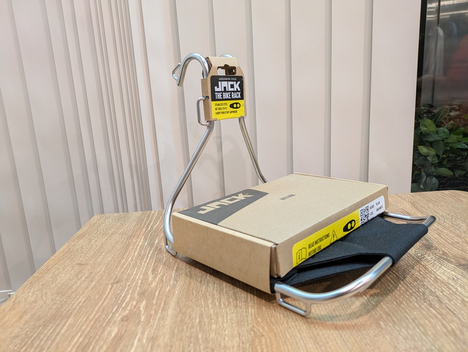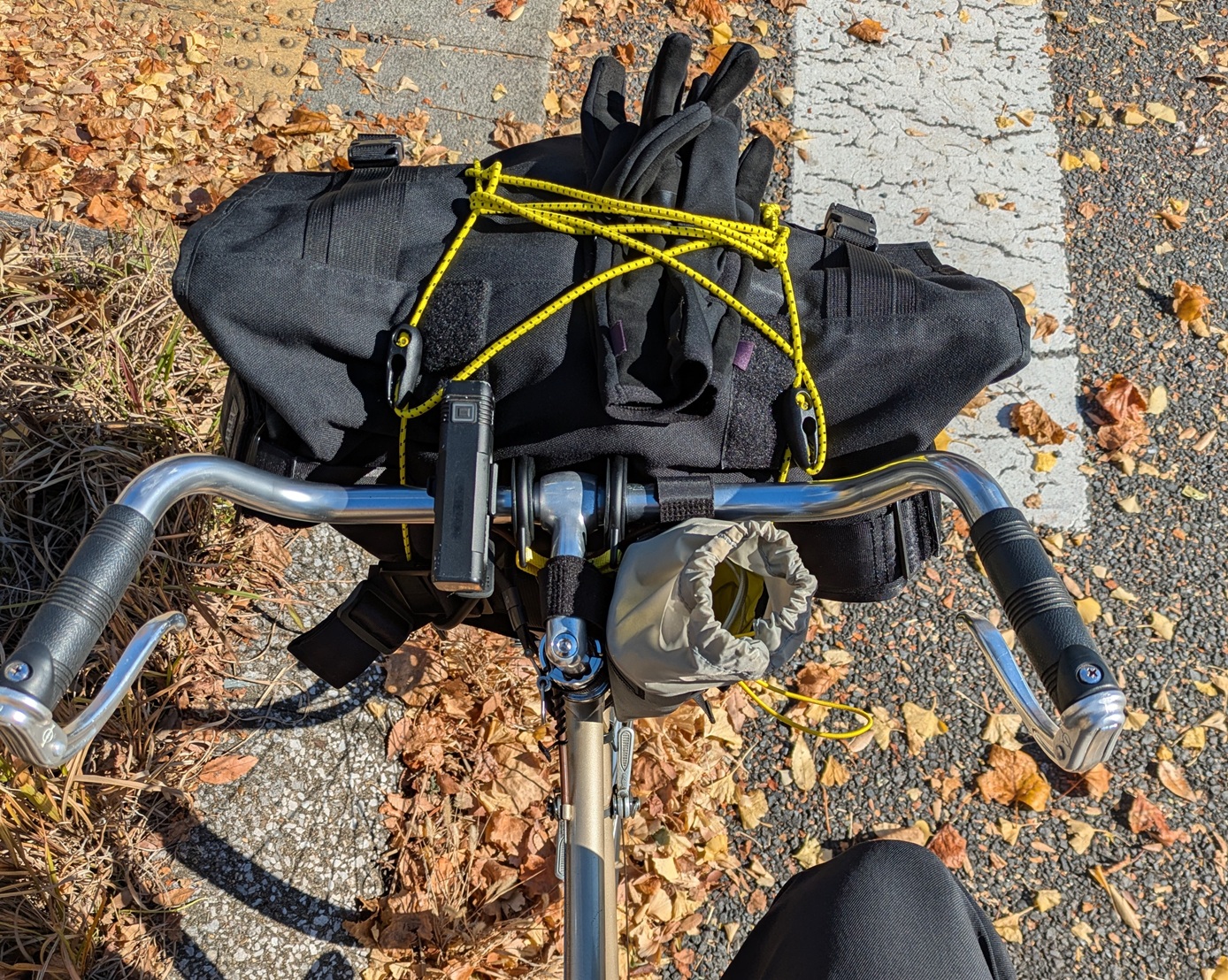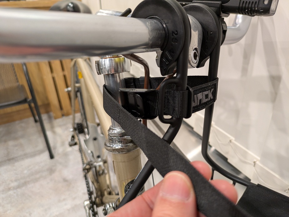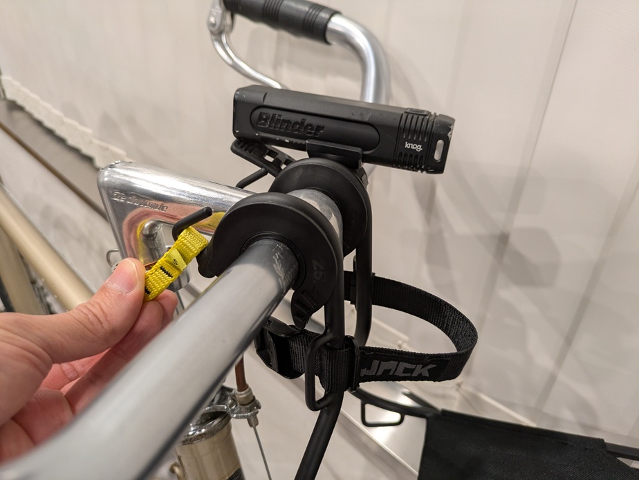 本体がフック状になってるので、ハンドルバーに引っ掛けます。