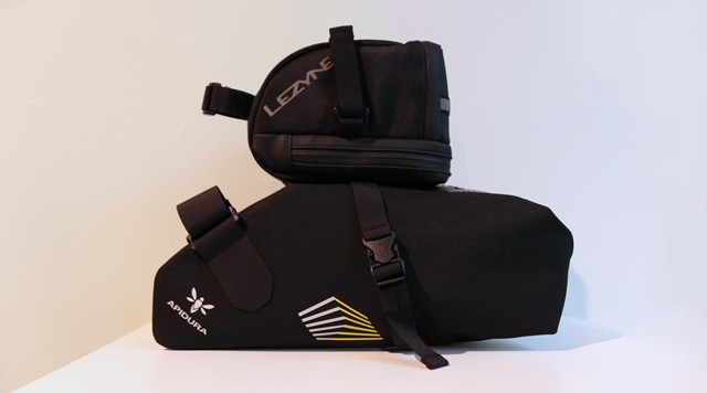 工具だけ入れるような小型サドルバッグと、5Lサイズのサドルバッグを比べてみてもこんな感じ。