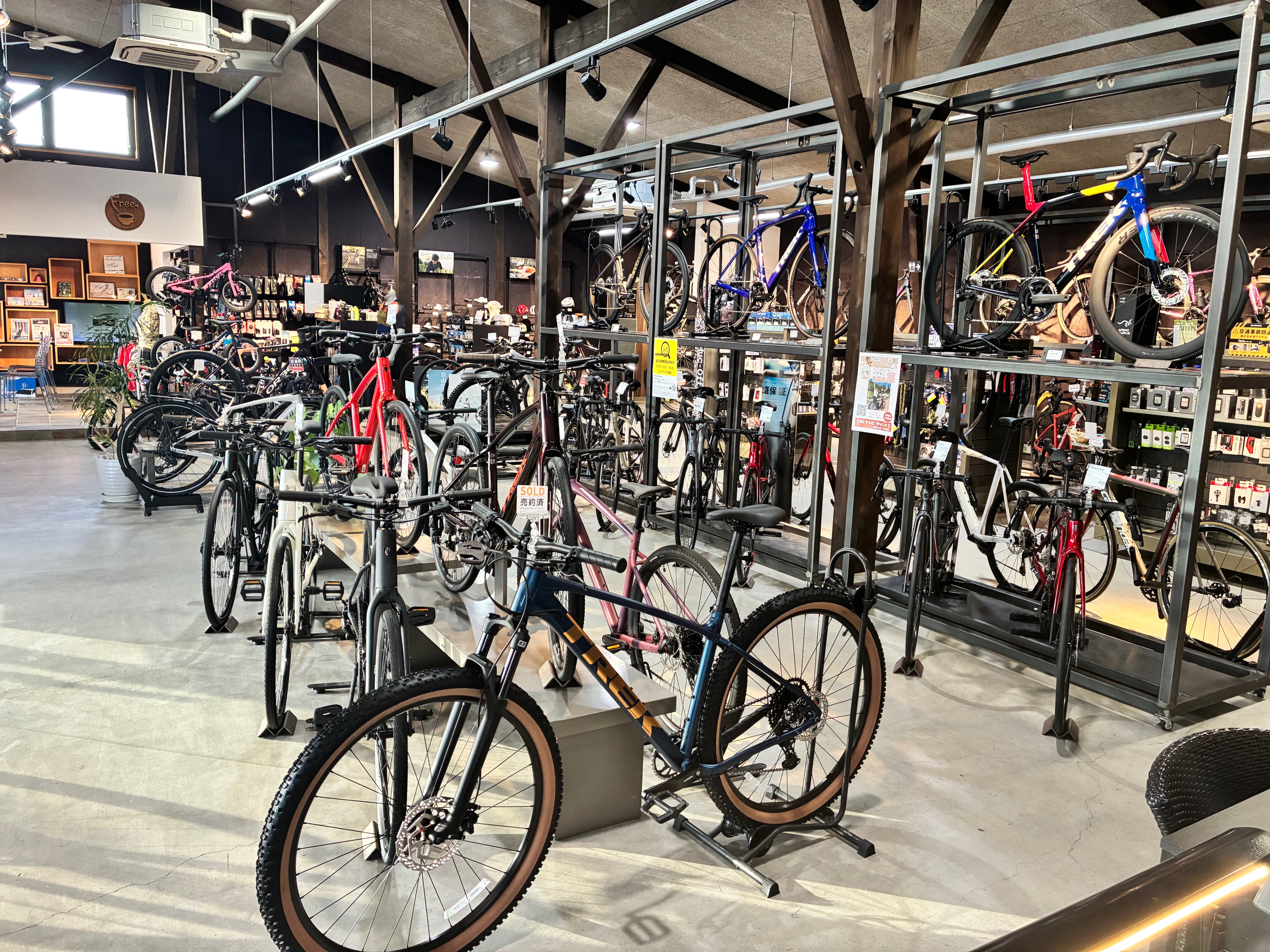 自然豊かな緑区にあるオンロードバイクを中心に展開する店舗です。サイクリストの憩いのスペースにはセルフカフェもあり、くつろいで過ごせます。