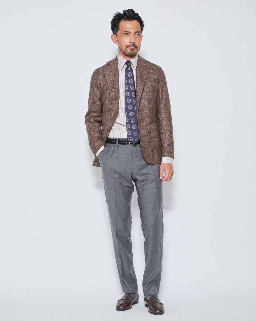 ナポリ仕立ての美しいシルエットを持つモデル「EASY」をベースにテーラードのディテールを加え、全体的に少しゆったりとしたシルエットに仕上げました。活動的なライフスタイルを送る人々へ、エレガンスと最高の品質を提供します。