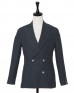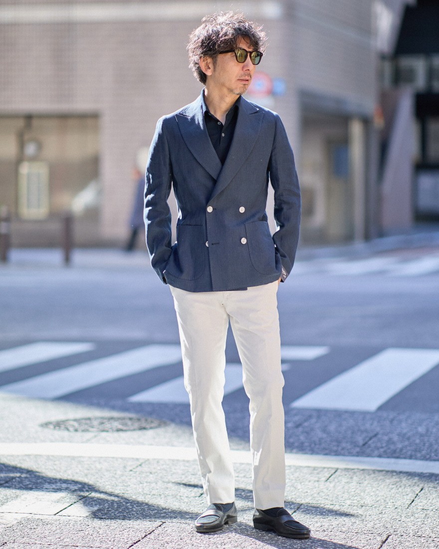 素材には、春夏シーズンに最適な上質リネン100%を採用。リネン特有のしなやかで肌離れの良いタッチに加え、清涼感のある軽やかな風合いが特徴です。風格を感じるピークドラペルに、アイボリーマーブルのボタンを配した端正なネイビーの織地が、クラシックな中にも爽やかで軽快なムードを演出します。