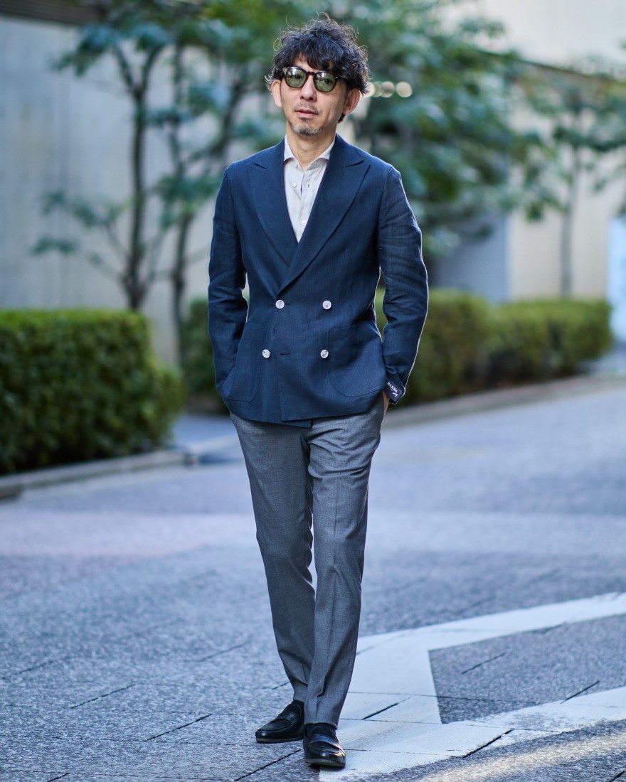 ナポリ仕立ての端正なシルエットが際立つ、BARBAの代表モデル『EASY』のダブルブレスト仕立て。