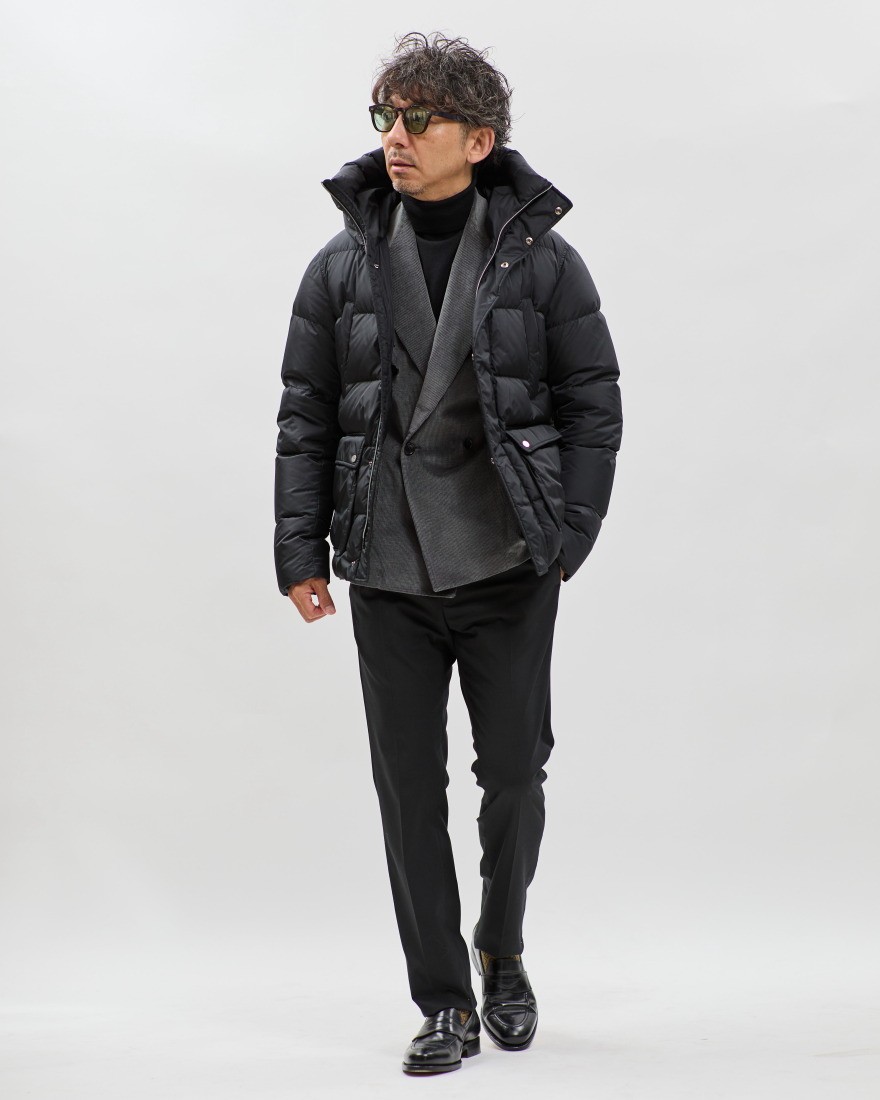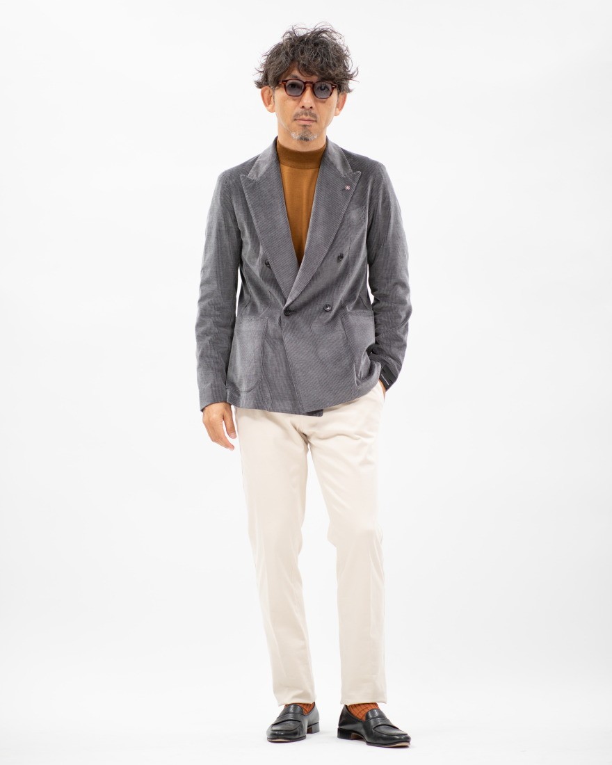 スタイリッシュな重厚感を持つダブルブレストながら、薄手のコーデュロイ生地を使用することで、軽快に着こなしやすいのも特徴。堅い印象はなく自然とこなれた印象に仕上がります。
