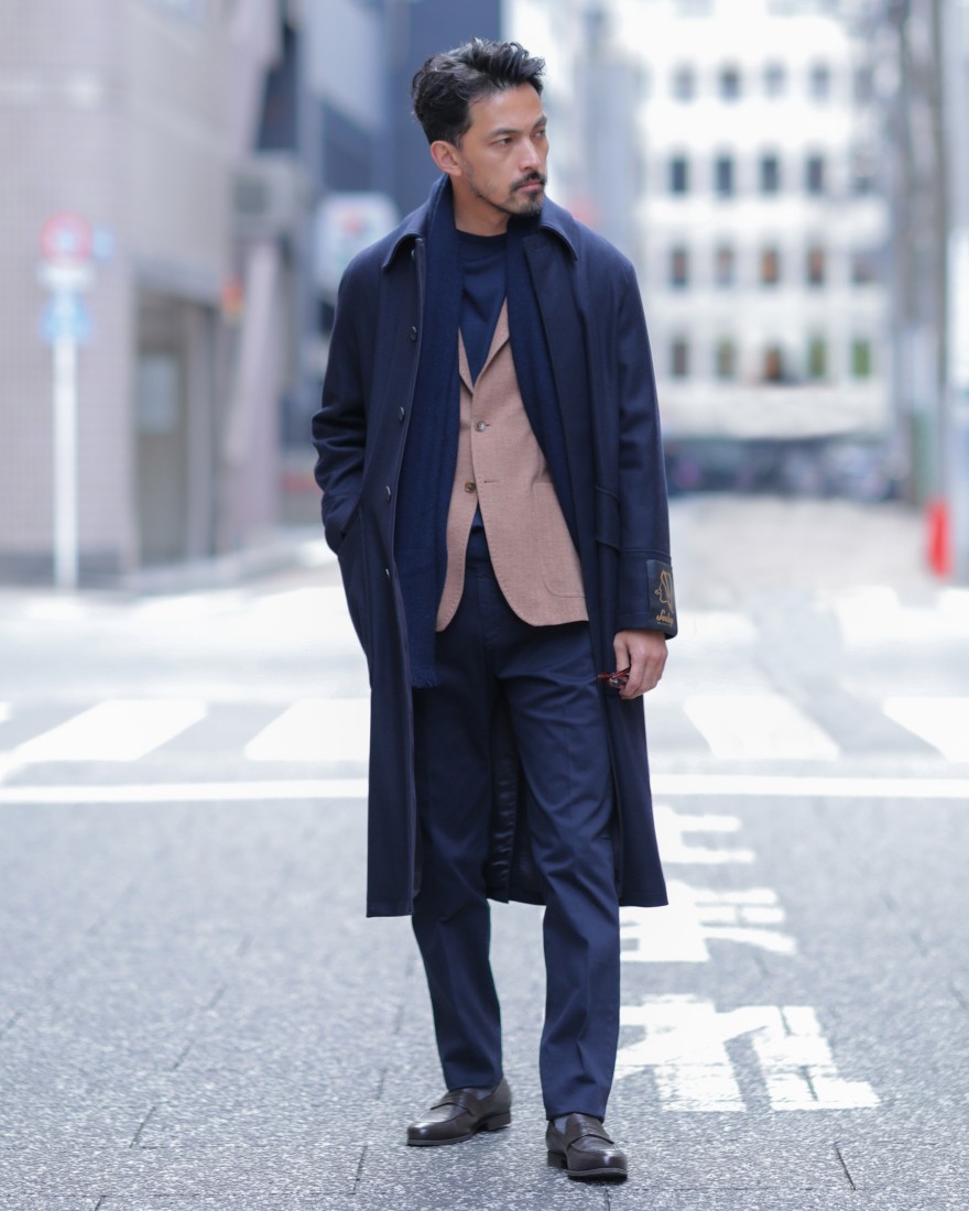 モデルサイズ:身長185cm/体重73kg/肩幅48㎝/胸囲95cm/ウエスト80cm/ヒップ96cm 着用サイズ:48