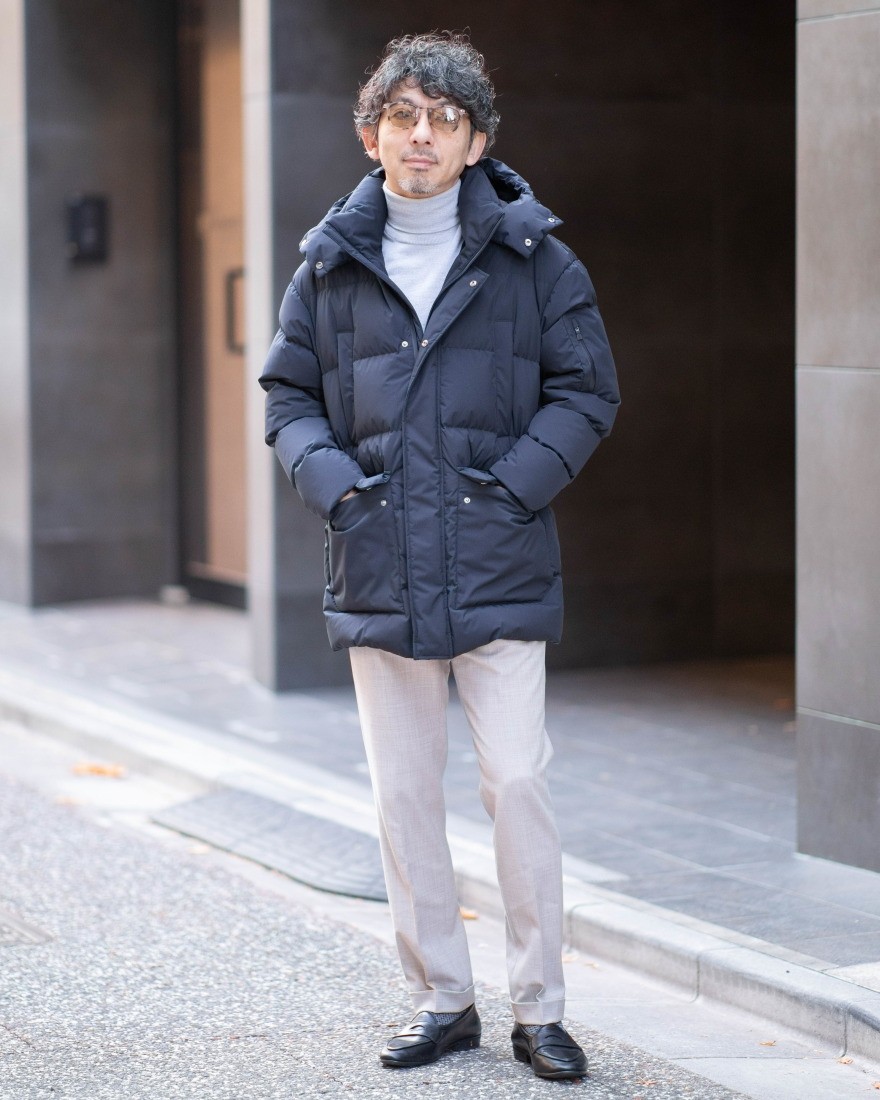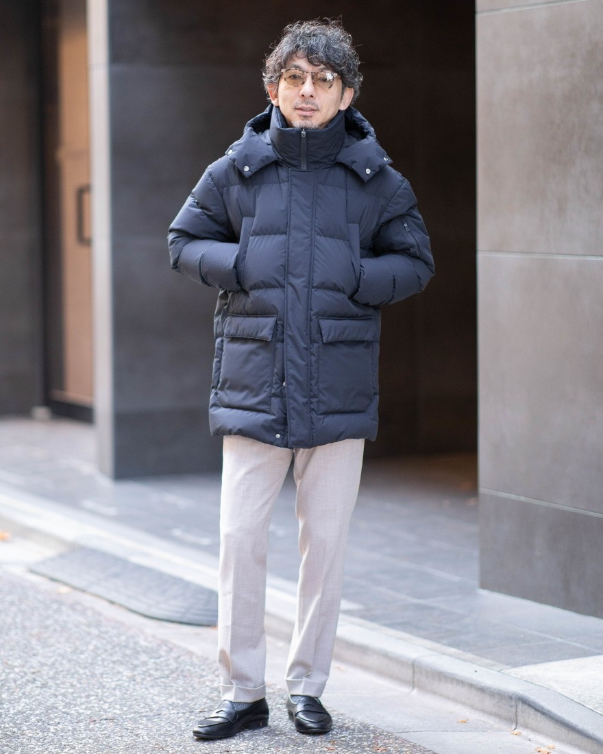 左袖にあしらわれた止水ジップのユーティリティポケットがさりげないアクセント。 軽さ、暖かさ、そしてデザイン性を高次元で融合させた、冬の主役となる一着です。