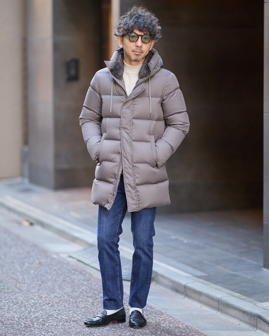 首周りの内側には取り外し可能なエコファーをあしらい、優しい肌触りとともにラグジュアリーな高級感を演出。スポーティなイメージのダウンを、上質な生地で仕立てることで、大人の装いに相応しい落ち着いた表情に仕上げています。
