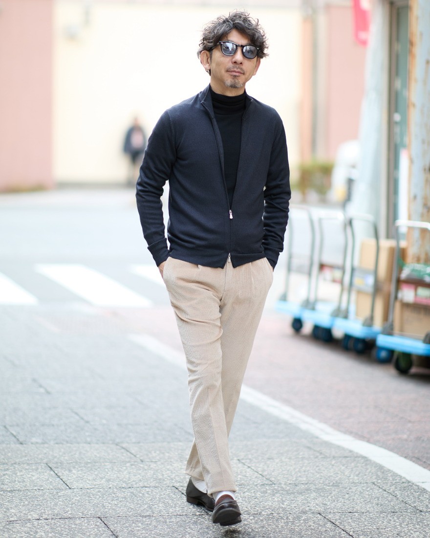 ジップを上まで閉めれば首元まで暖かく、防寒性も高まります。また、インナーとして着た際も、洗練されたジップのデザインがさりげないワンポイントになってくれます。