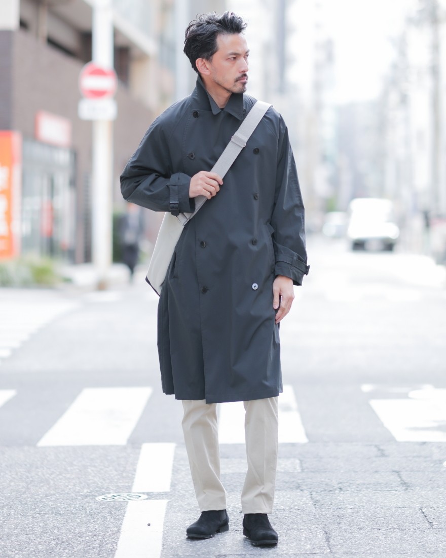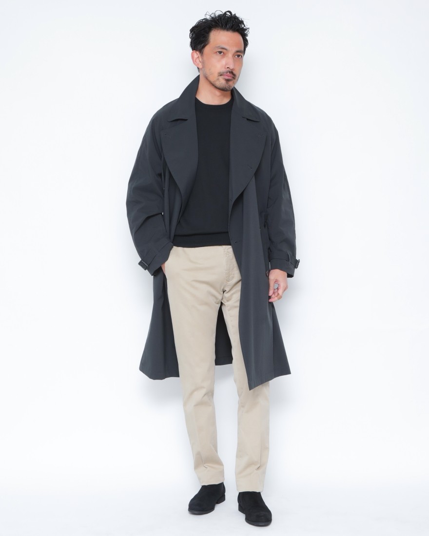シルエットは適度にゆったりめに、袖付けはセットインではなくラグランスリーブ仕様。装飾的な要素は最小限に留め、とことんミニマルなコートに仕上げています。