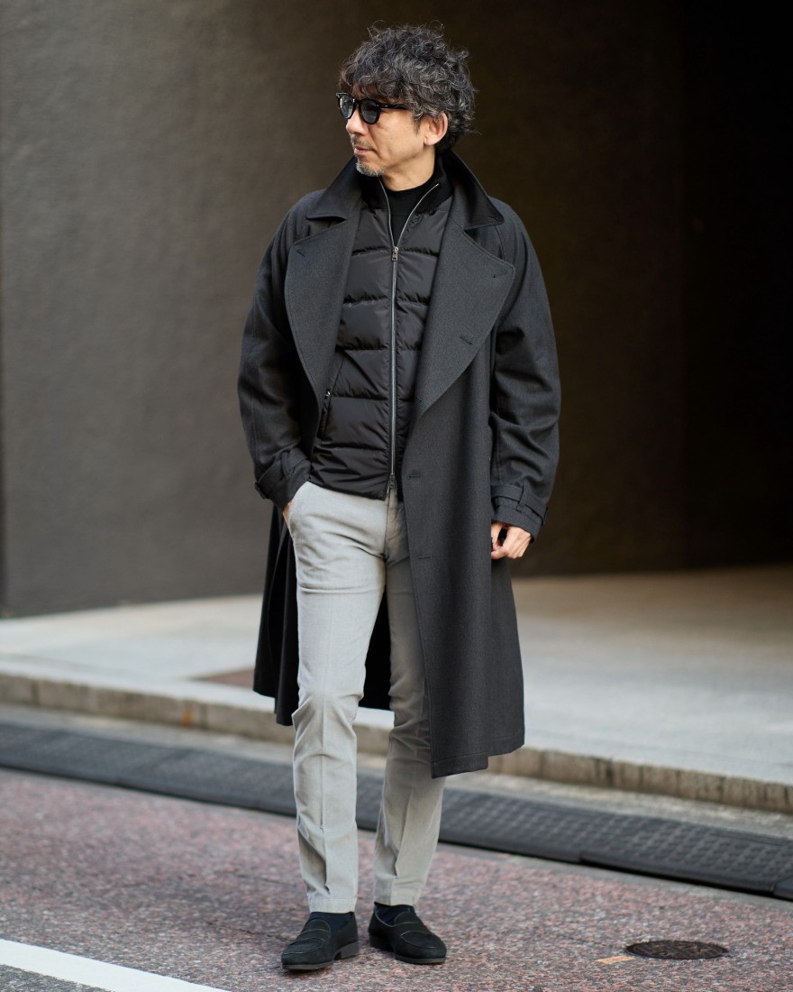 装飾を削ぎ落としたミニマルなデザインは、素材本来の美しさを最大限に引き立て、様々な着こなしを可能にします。ボタンを上まで留めてモダンなAラインを、共布のベルトでクラシカルな装いを演出するなど、その日の気分やシーンに合わせて多彩な表情を楽しめます。トラッドな佇まいに快適さを落とし込んだ、日常に寄り添う一着です。