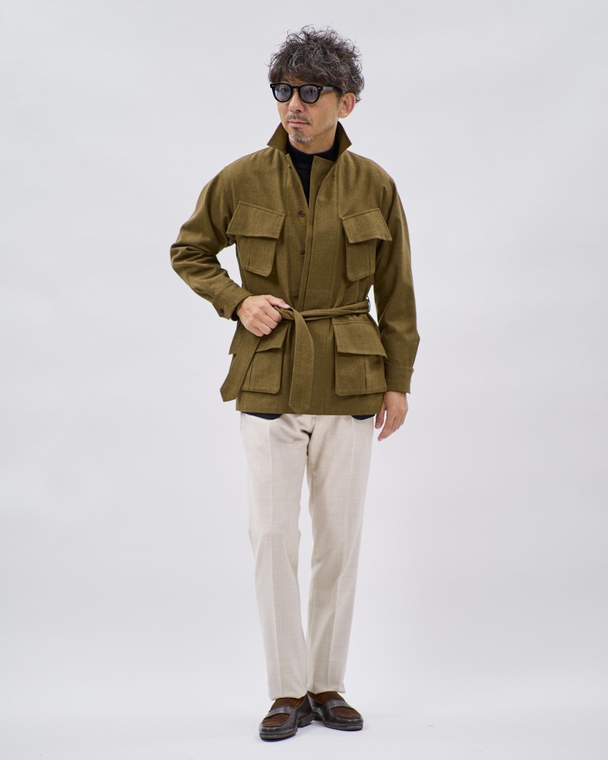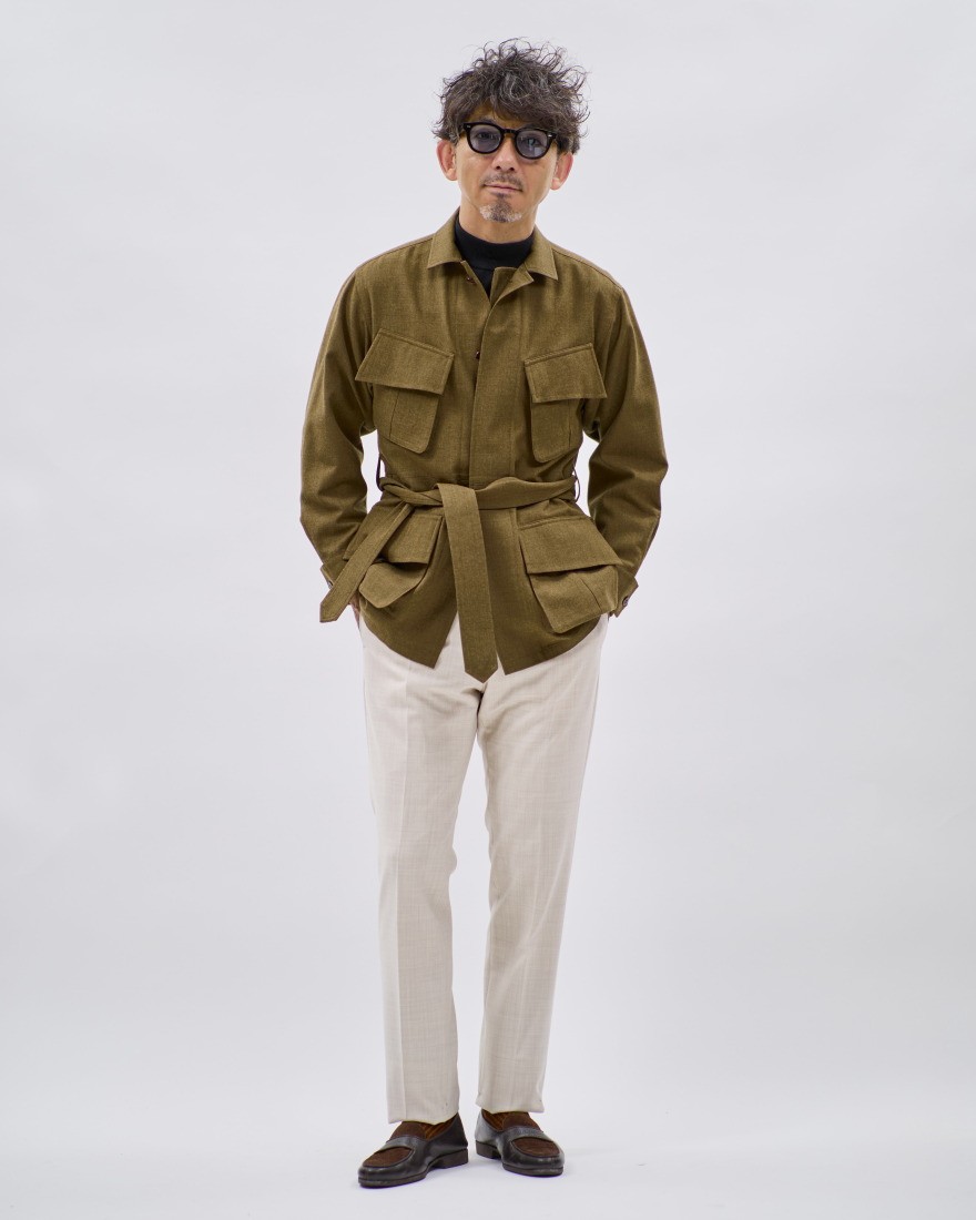 両肩のエポーレットは排除し、前身頃に配した4つのフラップパッチポケットの立体的なデザインを生み出しています。フラップは内側にボタンを配した比翼仕立の二重構造で、ボタンを留めてもすっきりとした見た目を保ちます。ポケットはしっかりとマチがとられ、少し斜めに配置された胸ポケットなど本格的なディテールも目を引きます。ウエストベルトは気分次第でアレンジが可能。ミリタリージャケットながら、ビジネスカジュアルなどデイリーにも羽織れる品の良さが漂う一着に仕上がっています。