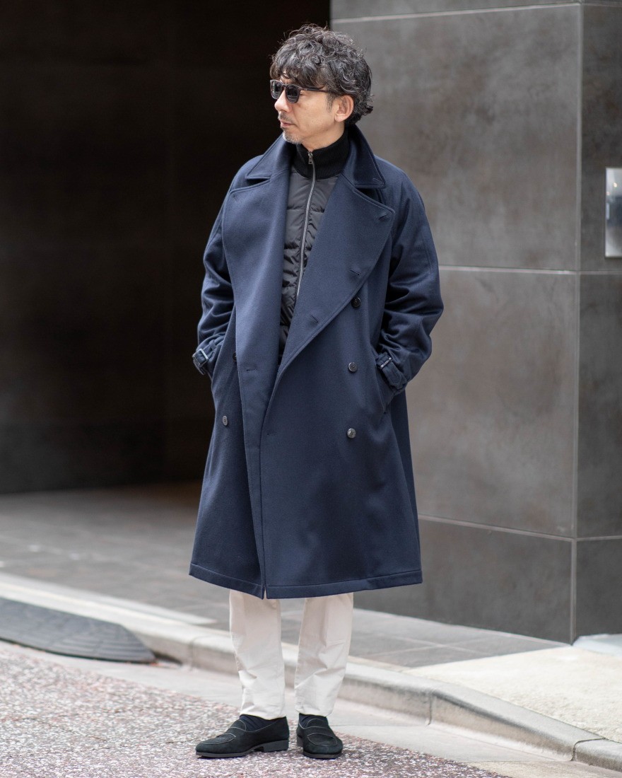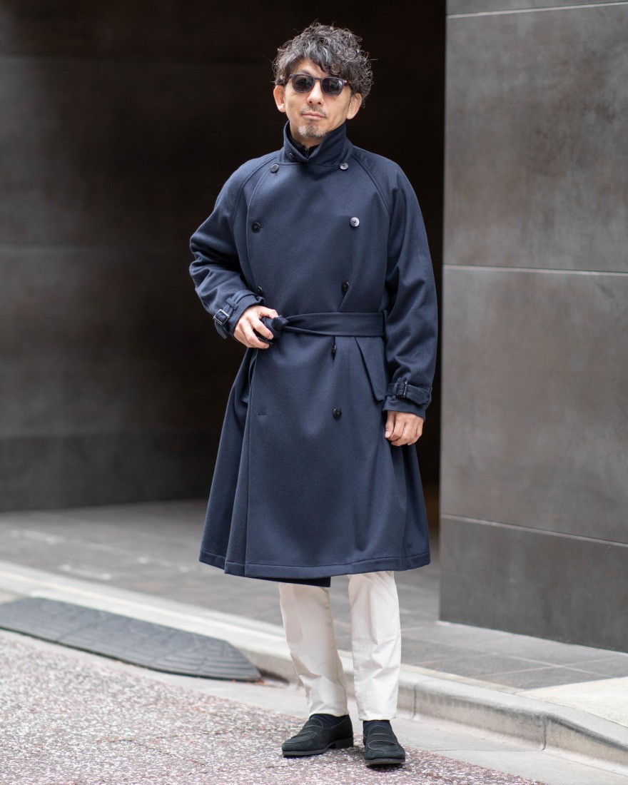ボタンを上まで留めてモダンなAラインを、共布のベルトを締めれば王道のクラシカルな装いを楽しむなど、その日の気分やシーンによって多彩な表情を演出。本物を知る大人のスタイリングに応える、オーセンティックな魅力が詰まった一着です。