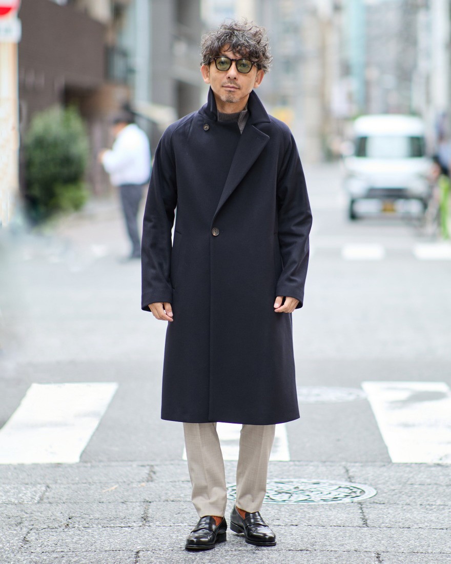 ややゆとりのあるAラインシルエットが、リラックス感とモダンな雰囲気を演出。フロントの打ち合わせは、シングルよりも深く、ダブルほど重くならない軽快なデザインが特徴です。