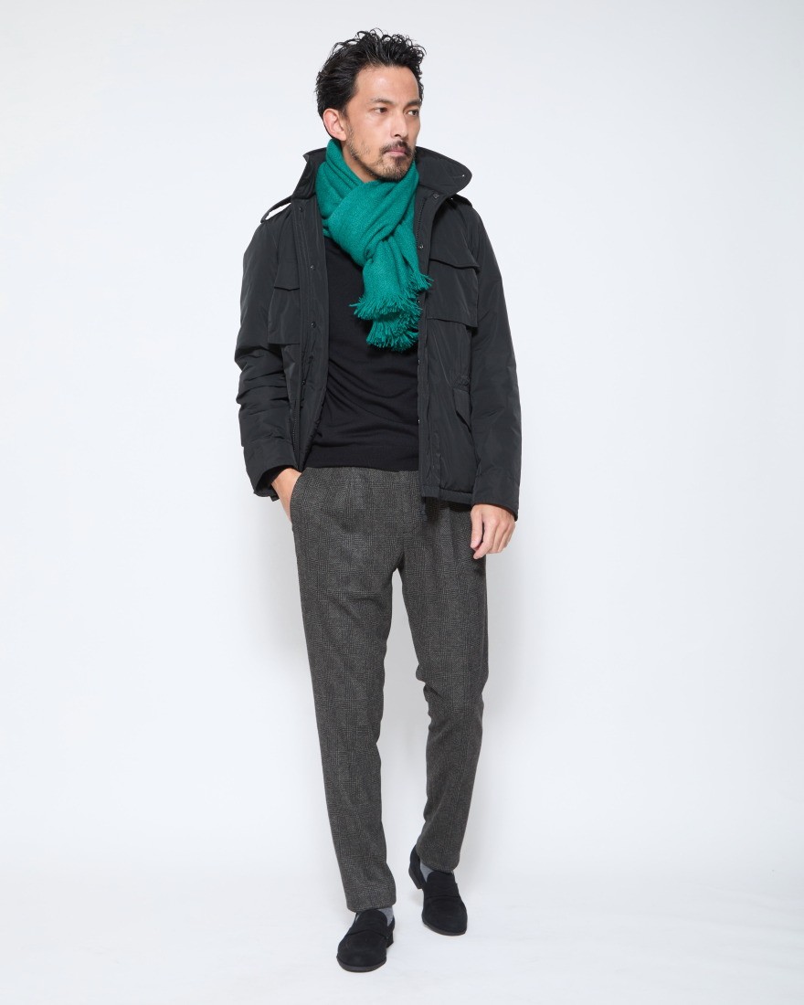 モデルサイズ:身長185cm/体重73kg/肩幅48㎝/胸囲95cm/ウエスト80cm/ヒップ96cm 着用サイズ:L