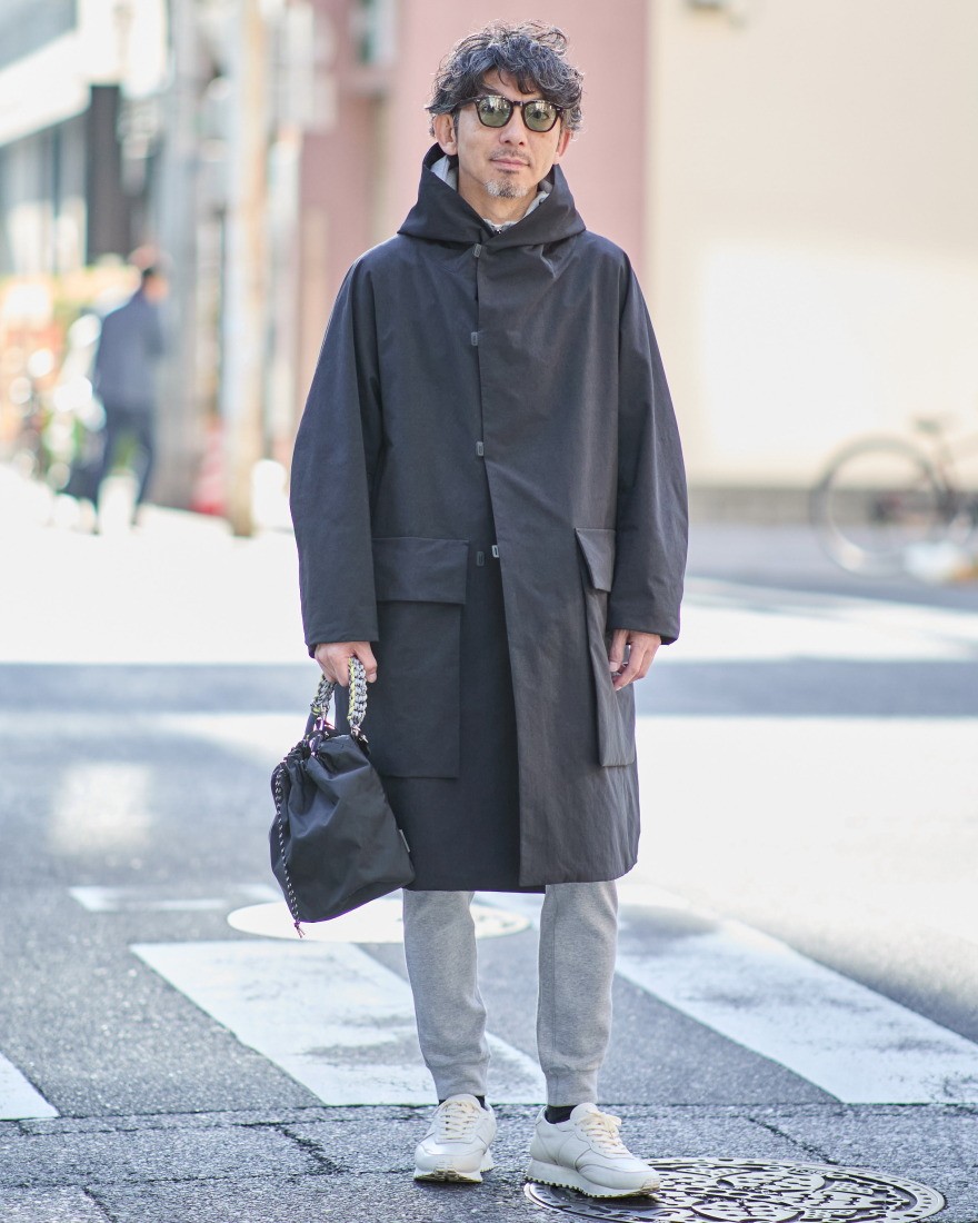 機能性だけでなく、計算されたシルエットも魅力の一つです。TEATORAのコート製品の中で最も身幅にゆとりを持たせたボリュームのあるデザインで、ジャケットなどの上からでもストレスなく羽織れるようアームホールも太めに設計されています。肩幅を特定しないパターンは着る人の体型を選ばず、頭部をしっかり覆う大きめのフードもポイントになってくれます。
