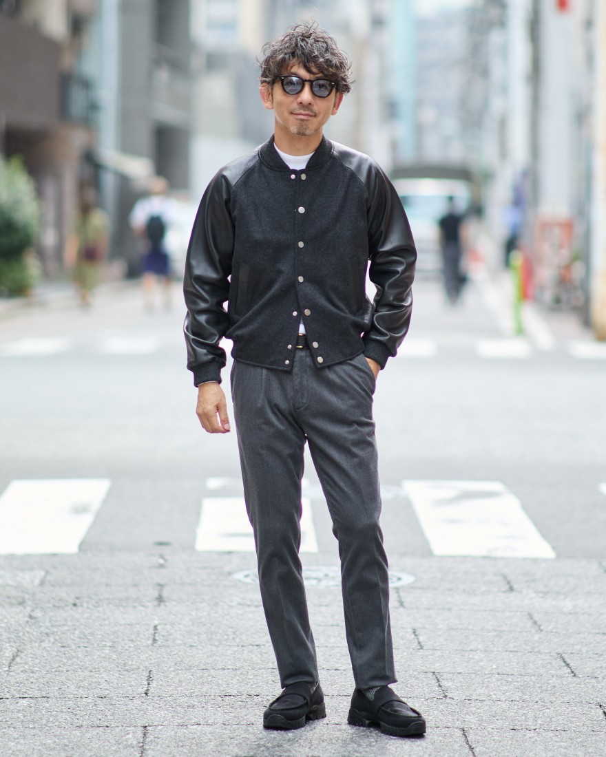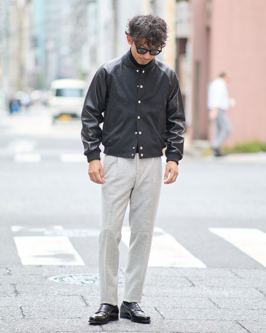 チャコールグレーのウールと、深みのあるブラックレザーが織りなす美しいコントラストは、まさに大人のための配色です。フロントにはメタリックな輝きが美しいスナップボタンをあしらい、シルエットを美しく引き締める、襟元、袖口、裾のリブ使いなど、細部にまでこだわりが宿ります。