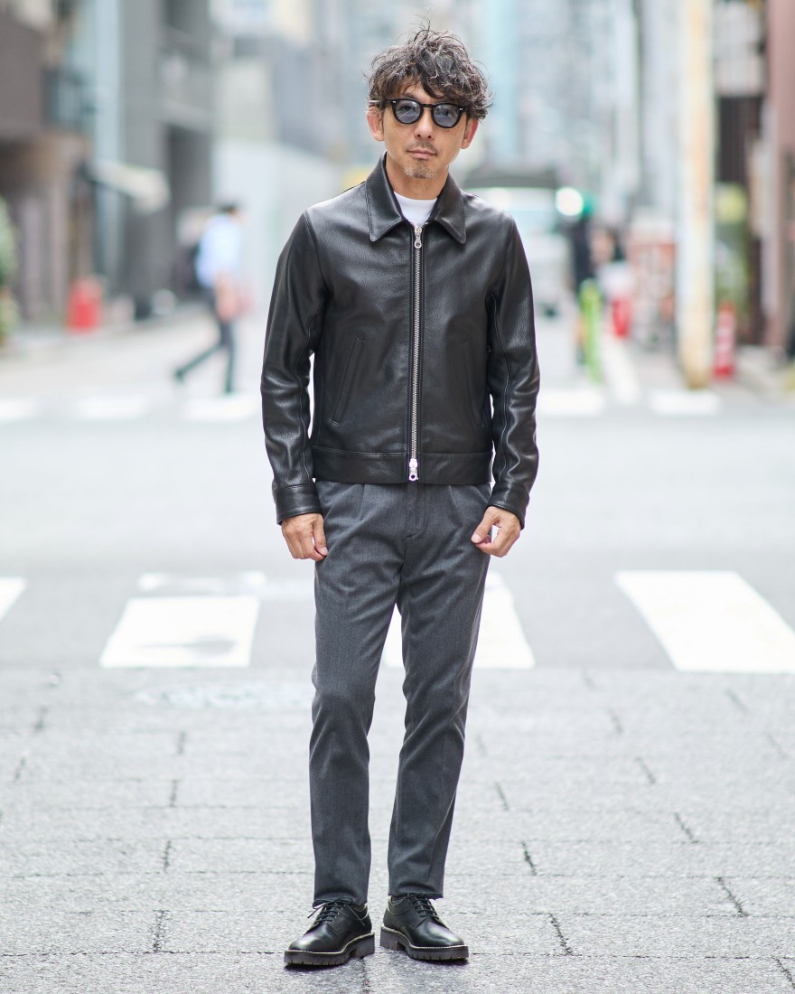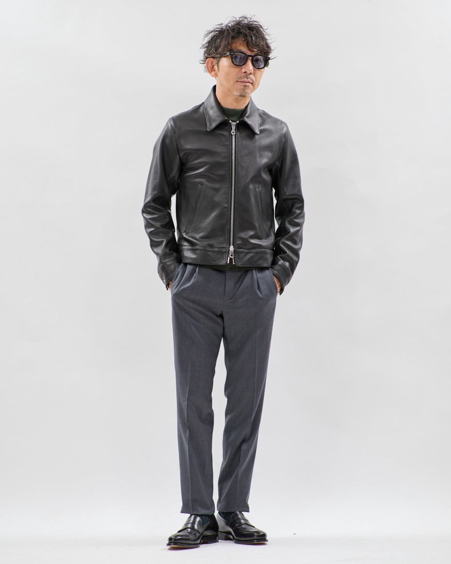 きめ細かなシボと上品な艶が目を引く程よい厚みのナッパゴートレザー。レザージャケットに求められる適度な厚みと、着心地を損なわないしなやかさを両立した、絶妙な質感が特徴です。