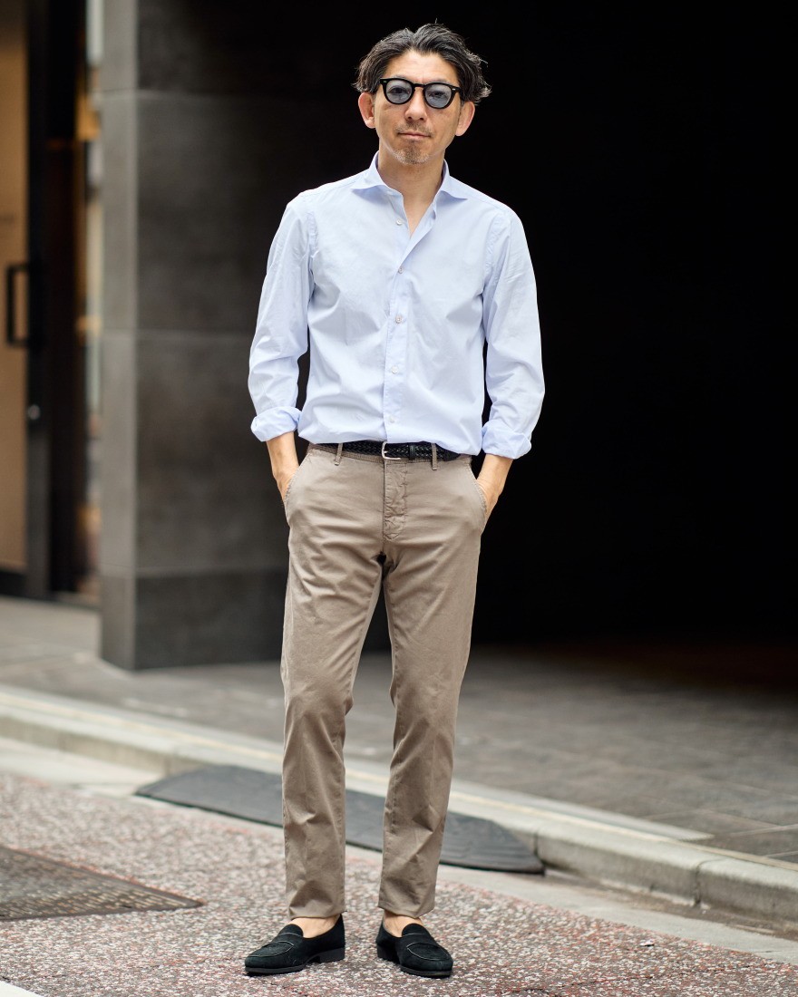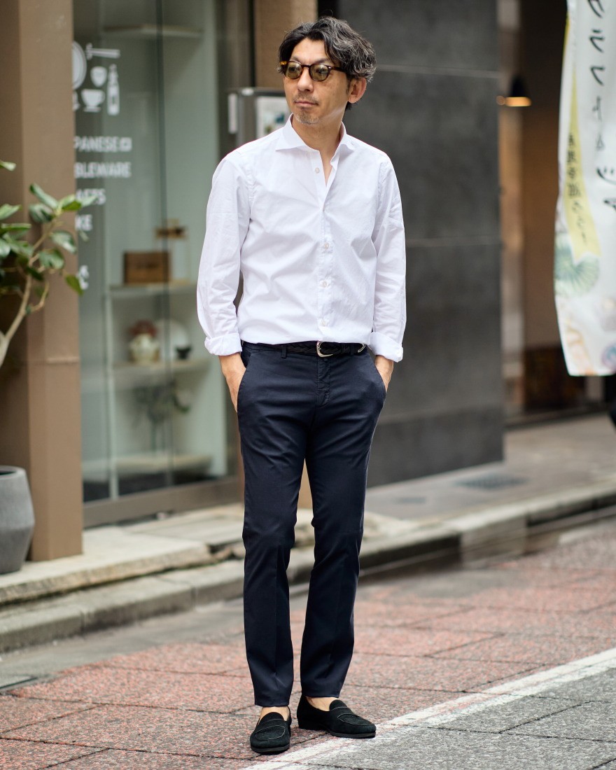 薄手の軽やかな風合いが心地よいカッタウェイシャツは、着こなし次第で通年を通して活躍できるのも魅力です。