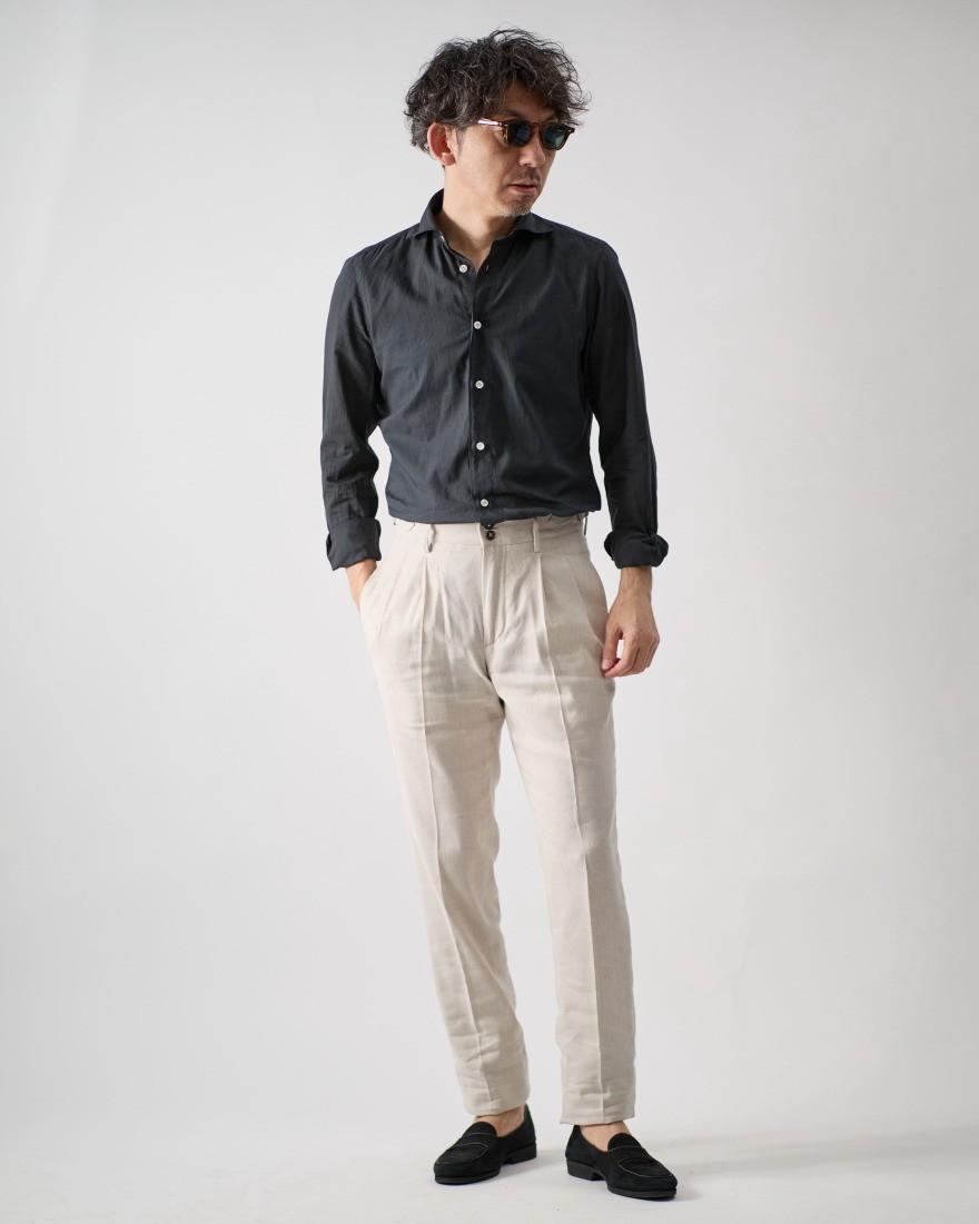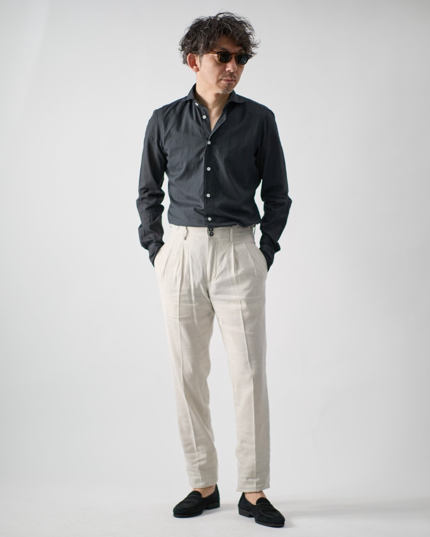 襟型には、美しい開きとフォルムが目を引くカッタウェイ「SIMONE」をセレクト。ボディにはスリムフィットの「BALI」を組み合わせることで、もたつきのない男性的な美しいラインを描き出します。イタリアンシャツの風格を漂わせつつ、現代的なリラックス感が共存する汎用性の高さが魅力。