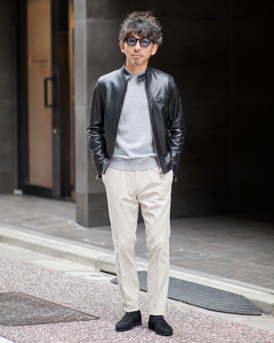 モデルサイズ:身長185cm/体重73kg/肩幅48㎝/胸囲95cm/ウエスト80cm/ヒップ96cm 着用サイズ:48