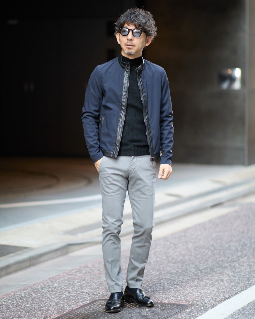 モデルサイズ:身長185cm/体重73kg/肩幅48㎝/胸囲95cm/ウエスト80cm/ヒップ96cm 着用サイズ:50