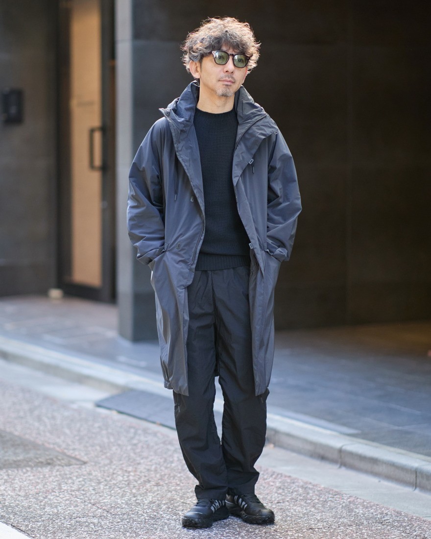 モデルサイズ:身長185cm/体重73kg/肩幅48㎝/胸囲95cm/ウエスト80cm/ヒップ96cm 着用サイズ:50