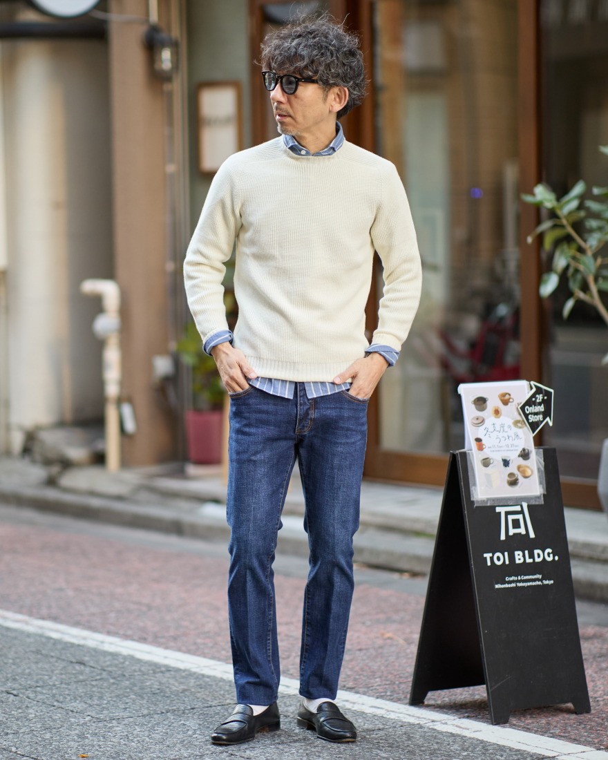 比較的細身のフィット感です。ジャストサイズがお好みの方は通常通り、リラックスした着こなしがお好みの方はワンサイズ上をおすすめします。
