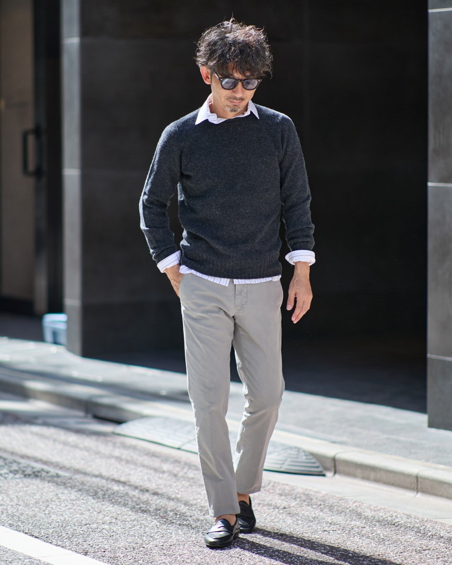 8Gのミドルゲージニットは、重すぎず軽すぎない程よい中肉厚がポイント。一枚でもニットらしい存在感があり、ジャケットやアウターのインナーとしてもすっきり収まる、非常に使い勝手の良い一枚です。