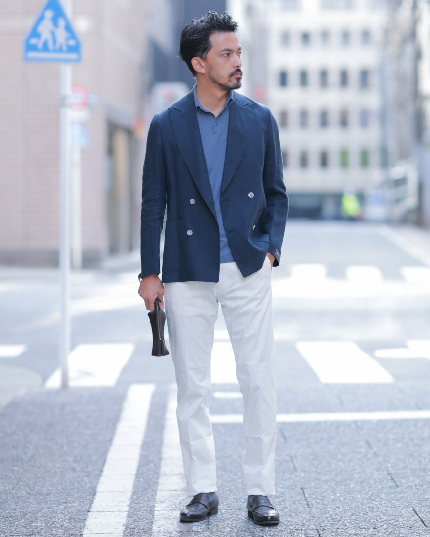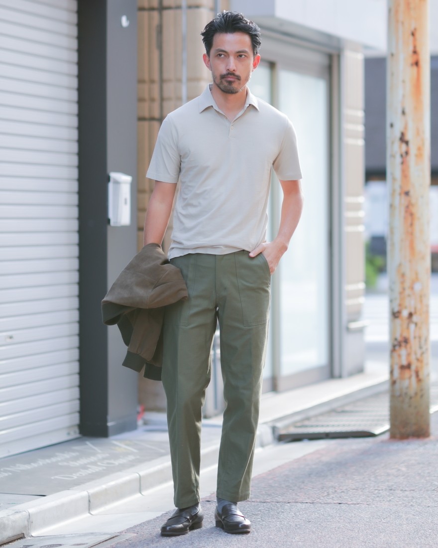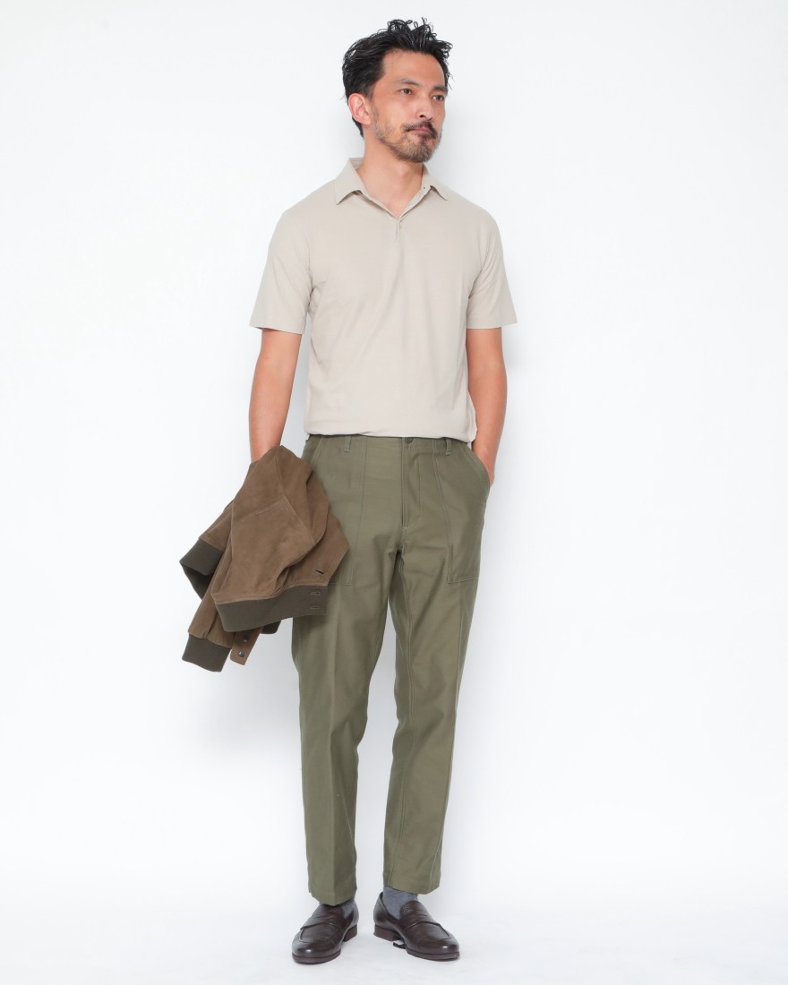 モデルサイズ:身長185cm/体重73kg/肩幅48㎝/胸囲95cm/ウエスト80cm/ヒップ96cm 着用サイズ:50