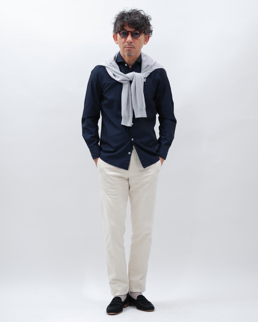 giannettoの定番として愛される、ネイビーシャンブレーシャツ。見る角度によって表情を変える、玉虫色のような光沢と陰影が美しい。シャンブレーならではの奥行きのある表情が魅力的。