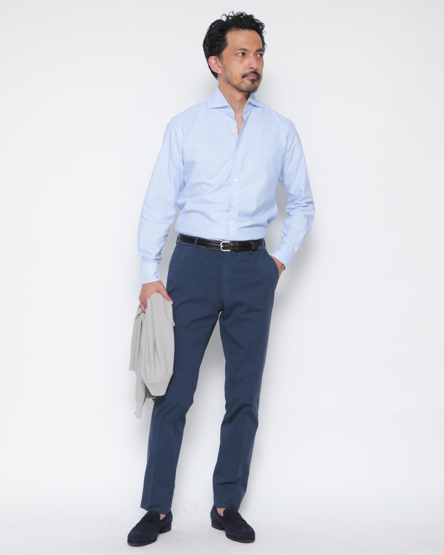 襟型には、ブランドを象徴するカッタウェイカラーをセレクト。ボタンを開けた際の襟元の立ち上がりが美しく、イタリアらしい開放的な雰囲気を演出します。