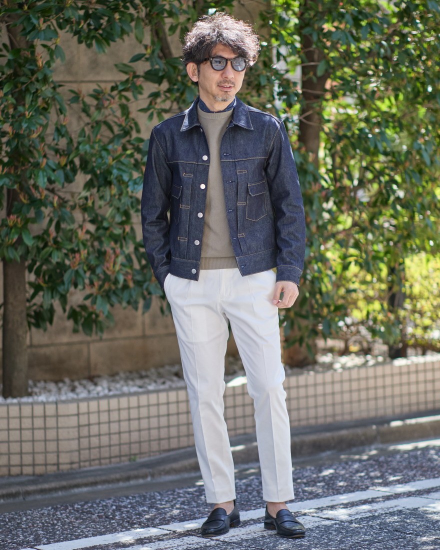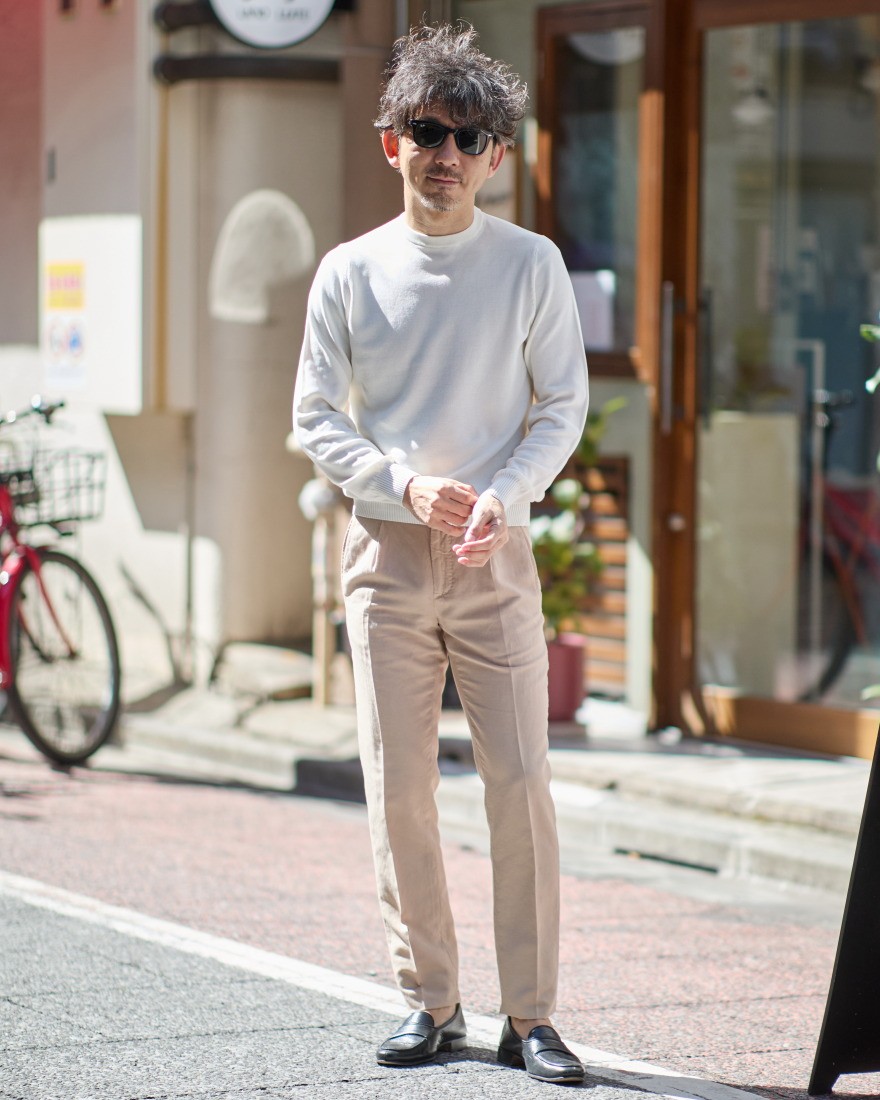 モデルサイズ:身長174cm/体重65kg/頭囲58cm/肩幅42cm/胸囲90cm/ウエスト78cm/ヒップ92cm/太もも54cm /手囲い23cm 着用サイズ:46/オフホワイト