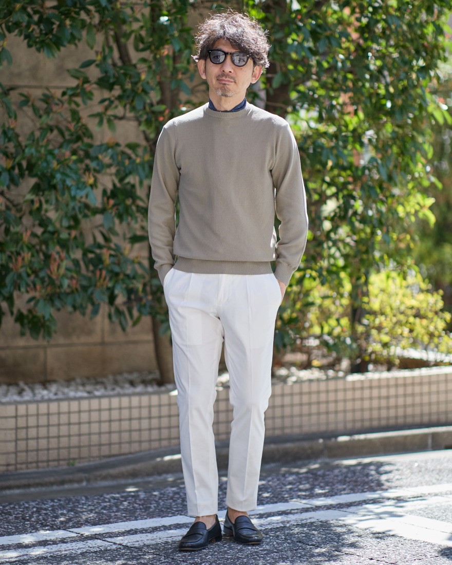 浅めに詰まったクルーネックが首元をすっきりとみせ、エレガントな表情を保つワンポイントに。一枚でさらりと着るのはもちろん、ジャケットのインナーとしても着膨れせず、スマートに着こなせる秀逸ニットは、大人のワードローブに欠かせない一着です。