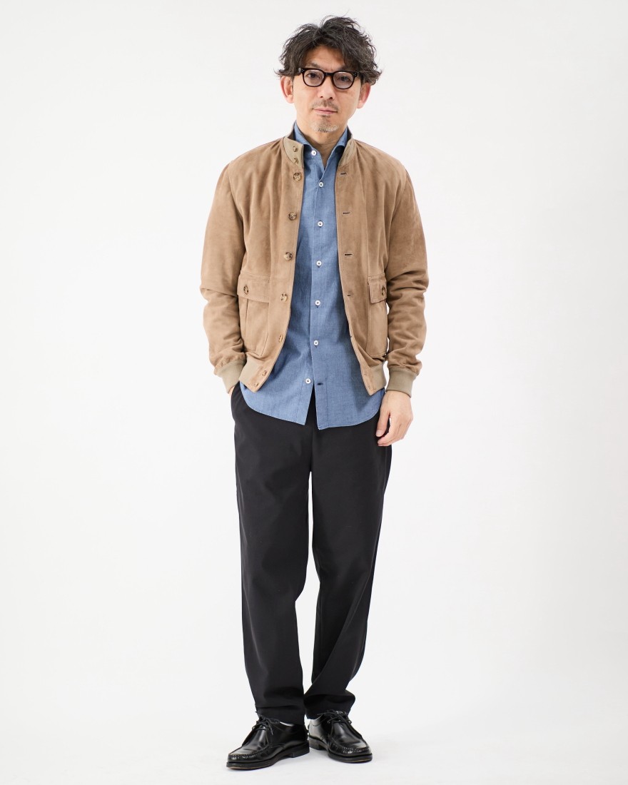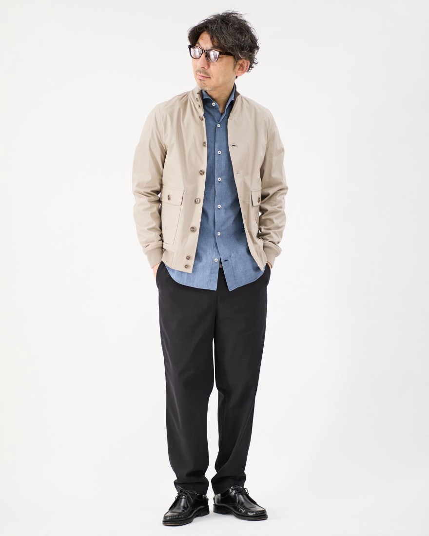 前立てはクラシカルな裏前立て仕様で、カジュアルな中にもエレガントな要素をプラス。第2、第3ボタンの間には、Giannettoのアイコンである太陽の刺繍が施されており、開襟時のさりげないアクセントに。細部にまでこだわった遊び心が、ディテールの美しさを際立たせています。
