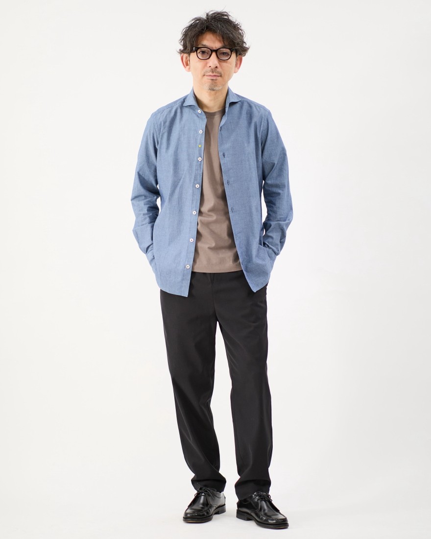 淡く柔らかなブルーが上品な表情を見せる、シャンブレー生地を使用したGiannettoの定番シャツ。コットン100%ならではのさらりとした薄手の生地感は、暑い季節でも肌離れが良く快適に着こなせます。