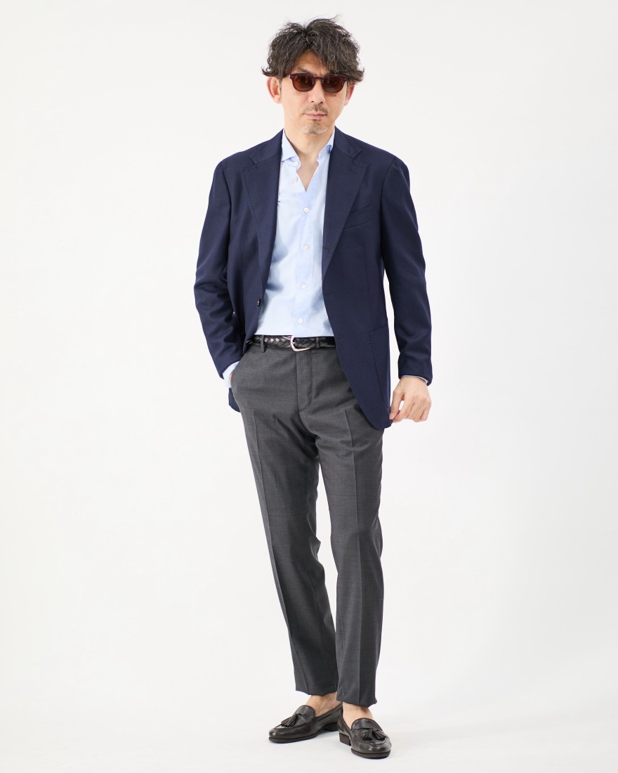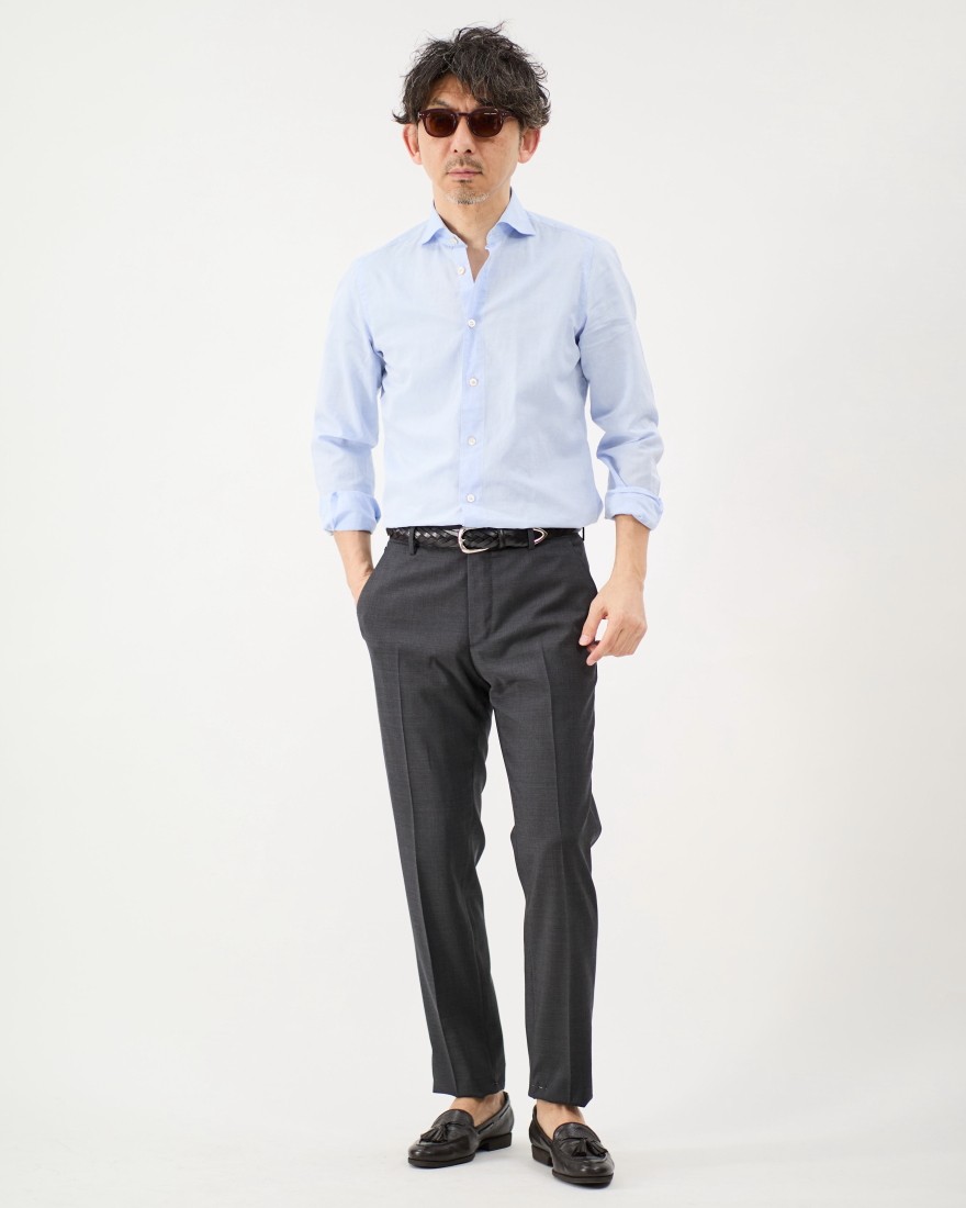 襟型にはカッタウェイカラーをセレクト。ボタンを開けた際の美しい表情が、イタリアらしい開放的な雰囲気を演出します。