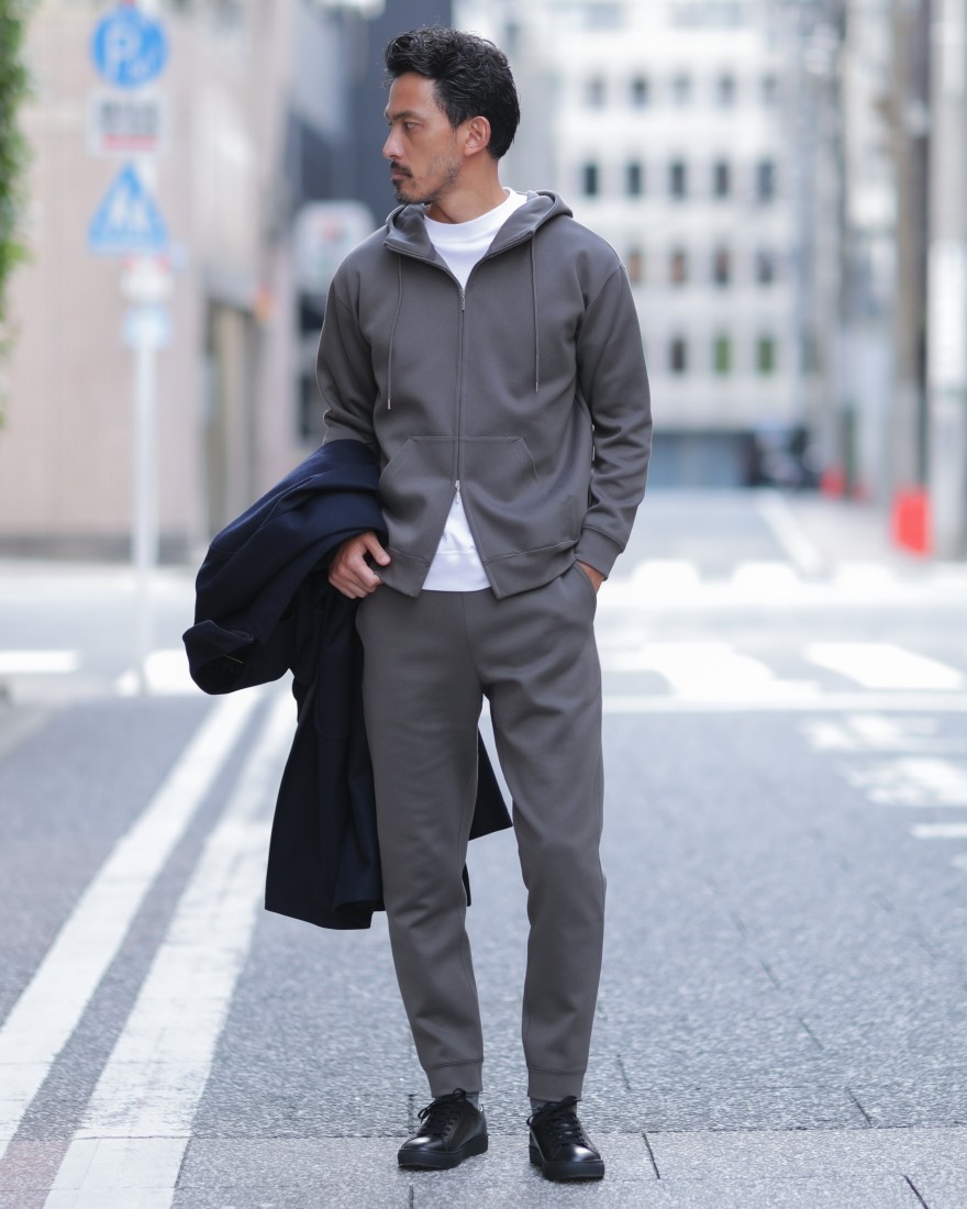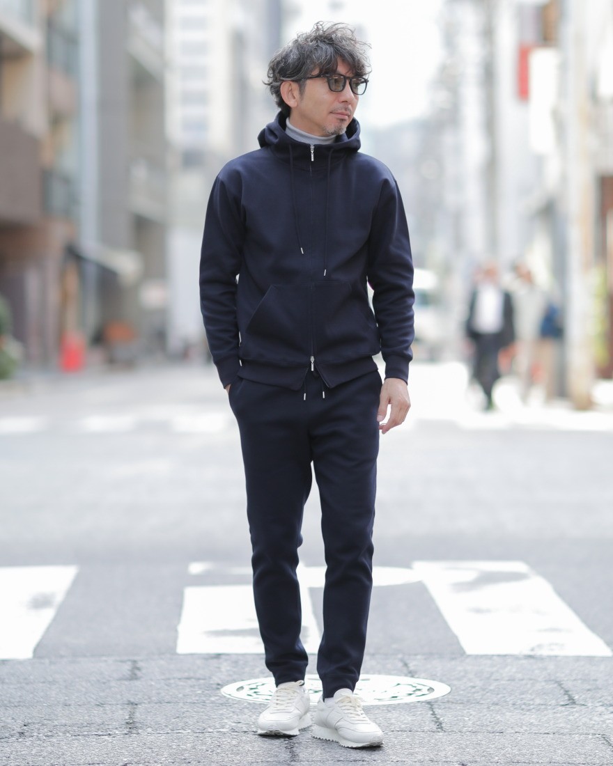 上品さを身に纏った大人のためのスウェットジップフーディ。艶やかな光沢感を感じる柔らく厚い生地で、ヌメリ感のある肌触りもこの素材ならではの個性的な強みです。また表と裏どちらも同じ素材を使用しているため、ムレにくく、フーディの醍醐味である快適さを提供してくれます。フードもしっかりと立つようなデザインで、スポーティな装いにも合わせやすいアイテムです。同じ素材のスウェットパンツでコーディネートを組むと上品なワンマイルウェアが完成します。