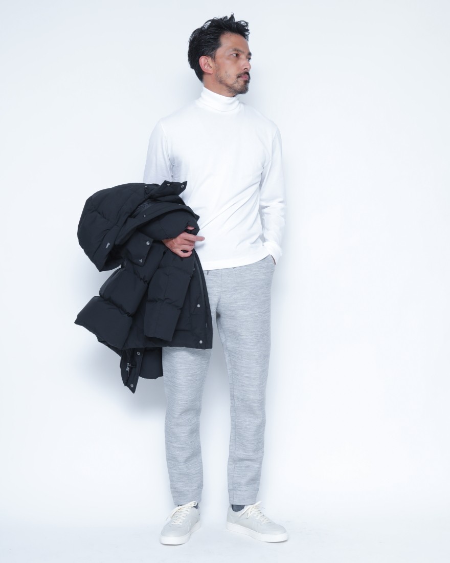 スッキリとしたシルエットとストレッチ性を兼ね備えているシンプルコーディネートにピッタリな一枚。