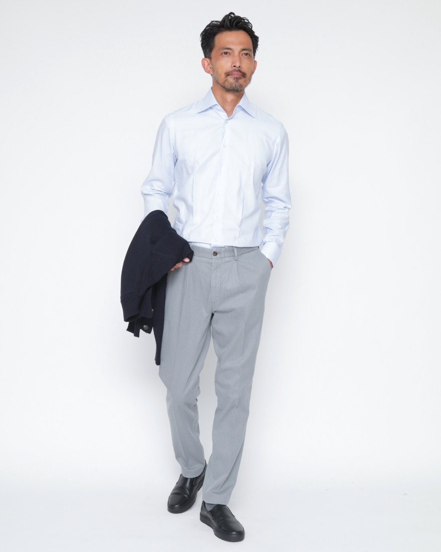 タイドアップでカチッと決めるのはもちろん、ネクタイなしでさらりと着こなすだけでもこなれたスタイルが完成します。
