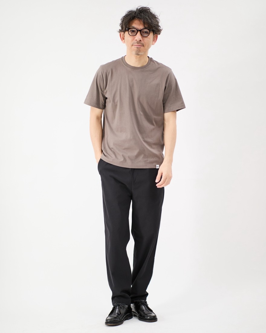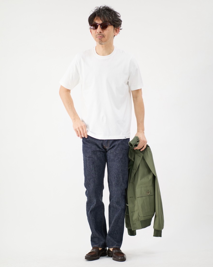 程よくゆとりを持たせたスタンダードなフィット感は、身体のラインを拾いすぎず、リラックスした着心地を実現。首元のリブも美しい仕上がりです。前身頃の裾にはブランドマークをあしらったタグを配し、さりげないワンポイントを添えています。