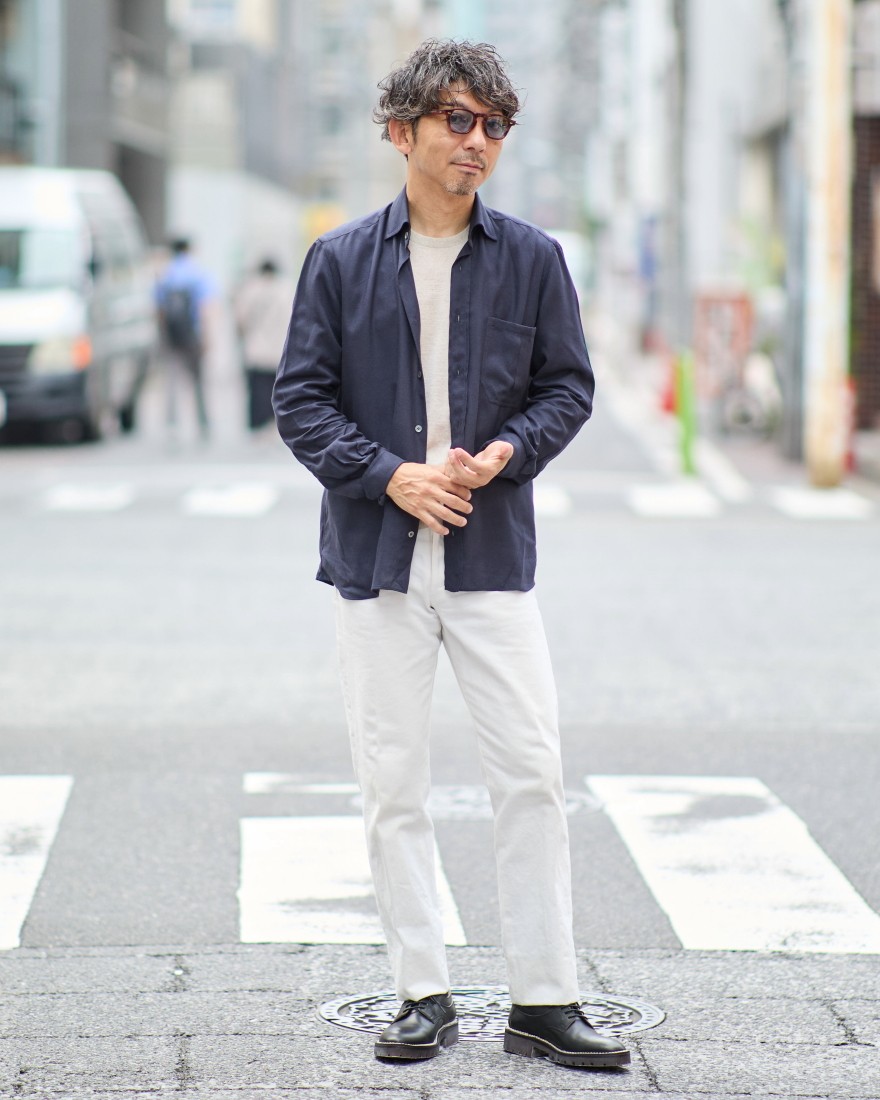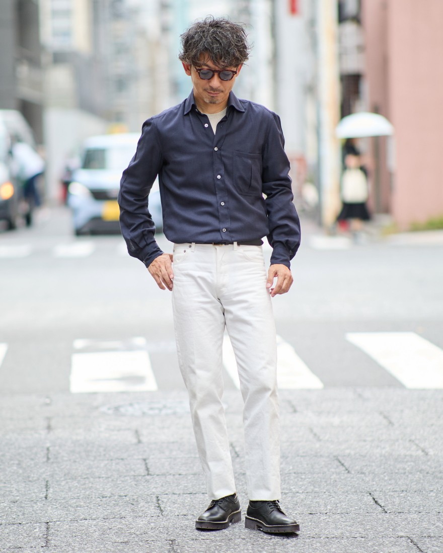 フロントはすっきりとしたワイドカラーで、胸ポケットにはインバーテッドプリーツがさりげないカジュアル感をプラスしています。バックはウエスタンヨークを採用し、センターにインバーテッドプリーツを配することで、遊び心あふれるデザインに仕上げました。プリーツの一部をステッチで留めることで、美しいシルエットを保ちつつ、立体的な表情が生まれます。