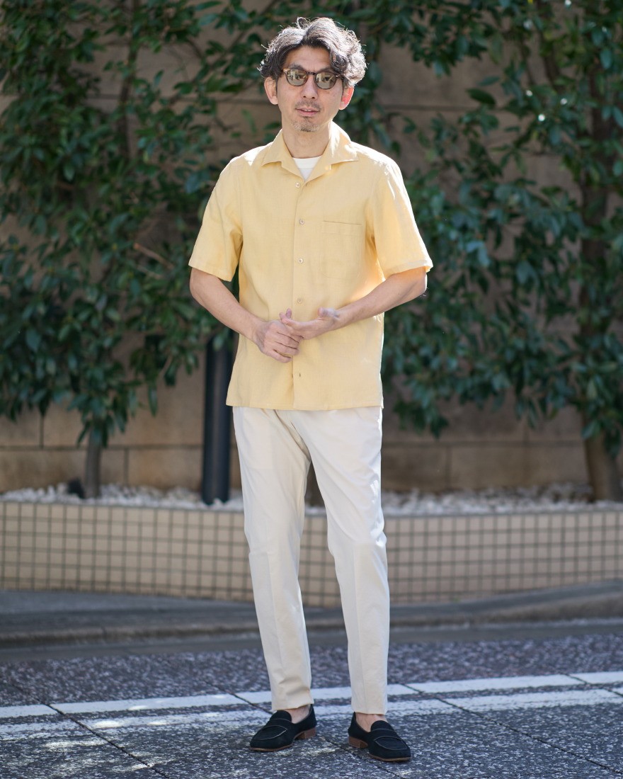 開放感のあるデザインが暑い季節に映えるオープンカラーシャツ【LECCE】。台襟を省いたワンピースカラー仕様のネックラインは、切り替えを設けないことで、自然で美しいロールの返りと柔らかな表情を生み出しています。