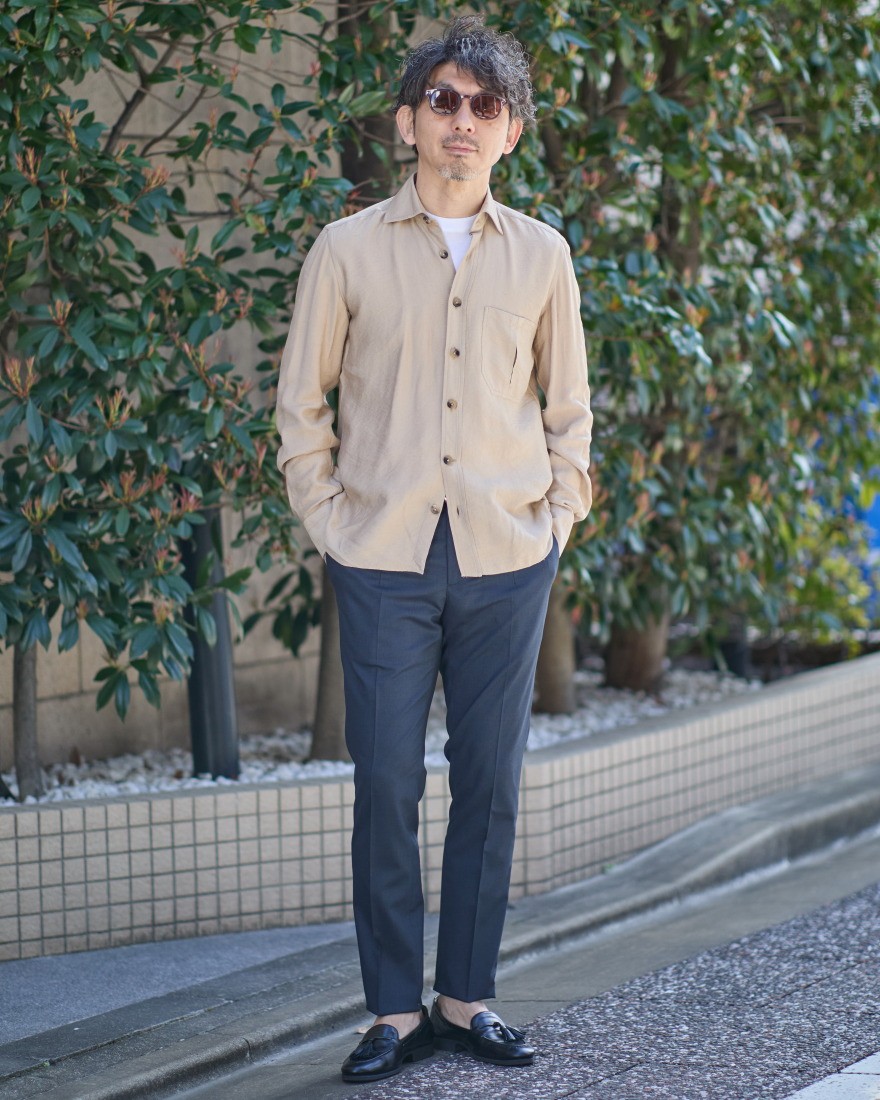 素材には、ビスコースとナイロンをブレンドした、しなやかな落ち感と軽さを持つ生地を採用。自然なシワ感のある生地感で、近くで見ると浮かび上がる繊細な織りの表情が、着こなしに深い奥行きを与えます。まるでヴィンテージシャツのような趣のある風合い。気温が高くなる季節、さらりと軽快に袖を通したくなる一枚です。